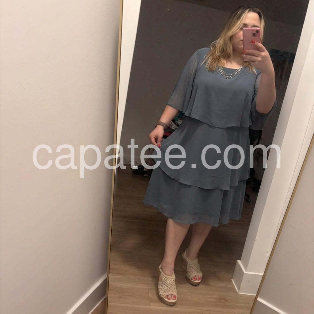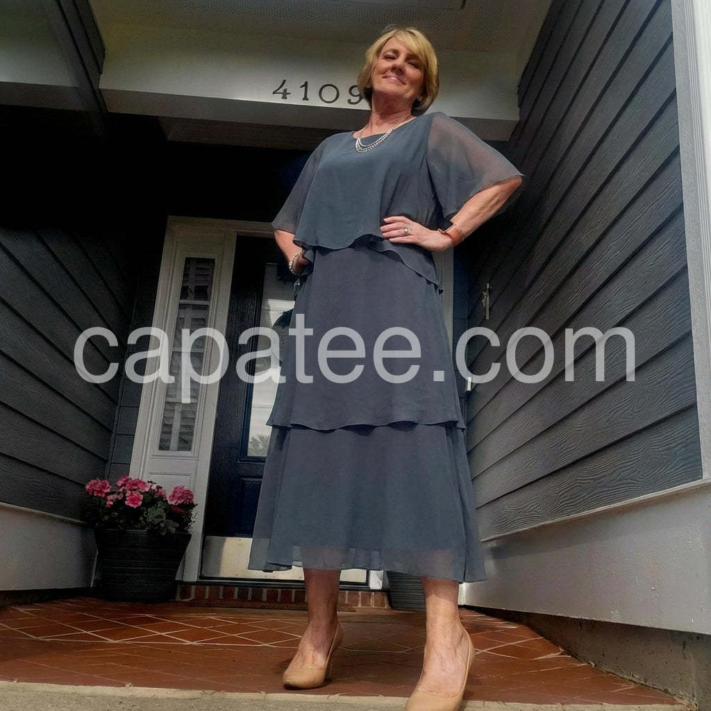 I bought this dress for my daughter's wedding and it was absolutely perfect. The layered design is incredibly flattering and hides any tummy flaws beautifully. The chiffon material flows elegantly as you walk. Highly recommend!
