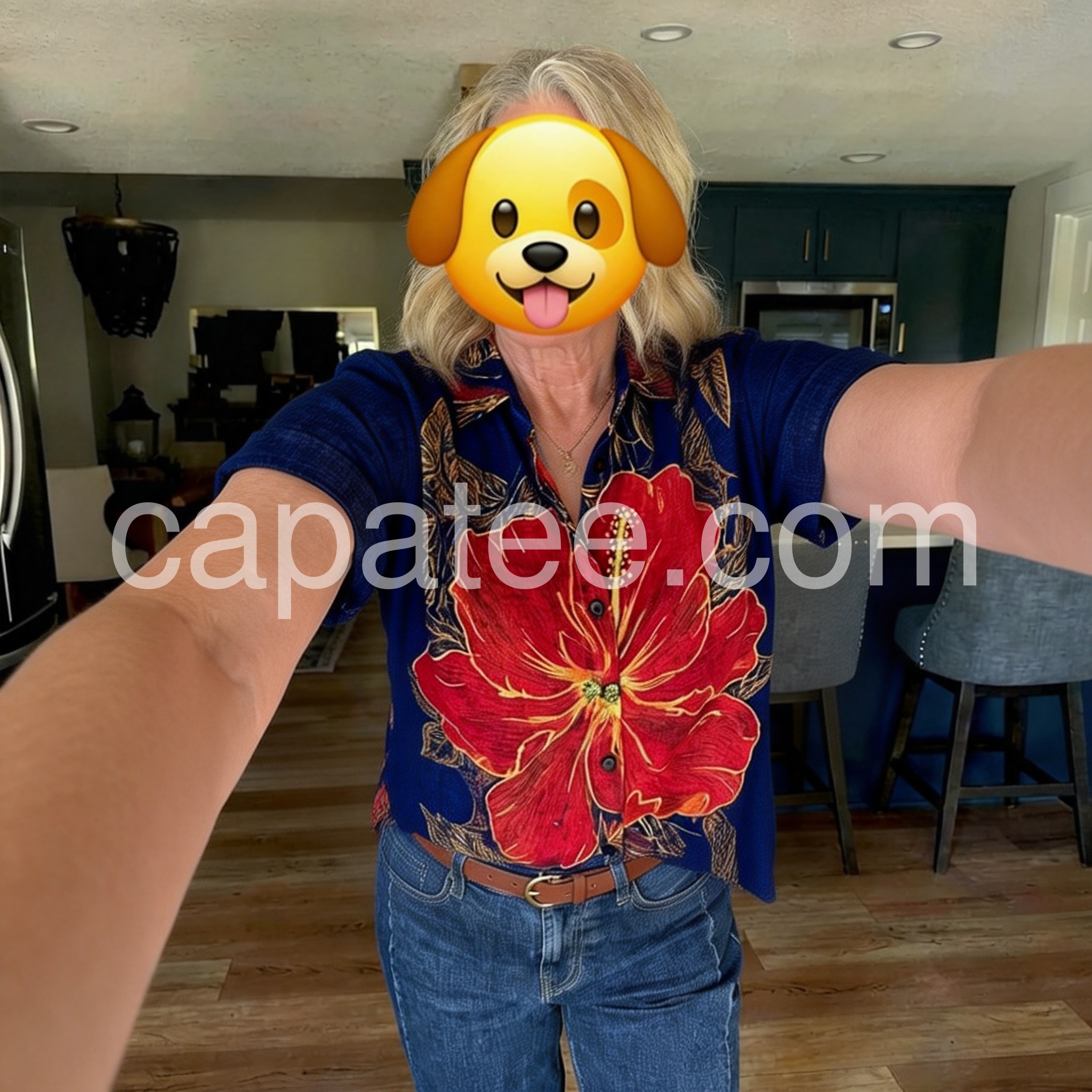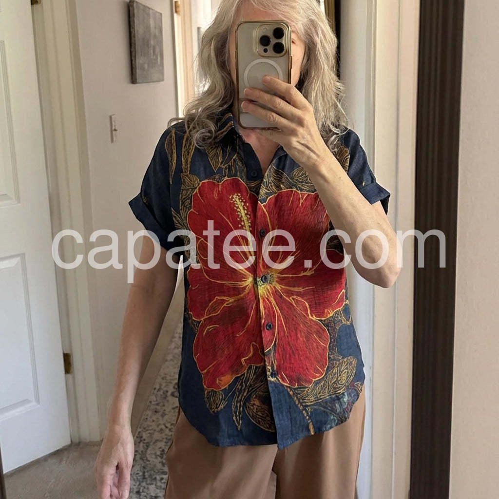Channel island vibes with this Bold Tropical Hibiscus Print Top, a vibrant statement piece that brings the essence of paradise to your wardrobe. Crafted from lightweight, breathable fabric—likely cotton or linen blend—it features a rich navy base adorned with a striking oversized red hibiscus flower outlined in golden yellow, complemented by intricate leafy patterns throughout. The classic short-sleeve shirt design includes a relaxed fit, button-down front, and rolled sleeves for an effortless, laid-back look. Perfect for pairing with denim jeans, high-waisted shorts, or flowy skirts, this top is ideal for beach days, tropical getaways, or summer city strolls. Its bold floral motif exudes bohemian charm and exotic flair, making it a standout choice for those who love fashion with personality. Inspired by the playful, romantic styles found on sites like Lulus, this shirt effortlessly blends artistry and comfort—ideal for adding a splash of color and confidence to your warm-weather wardrobe.