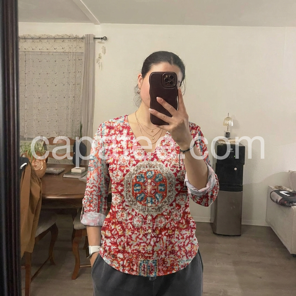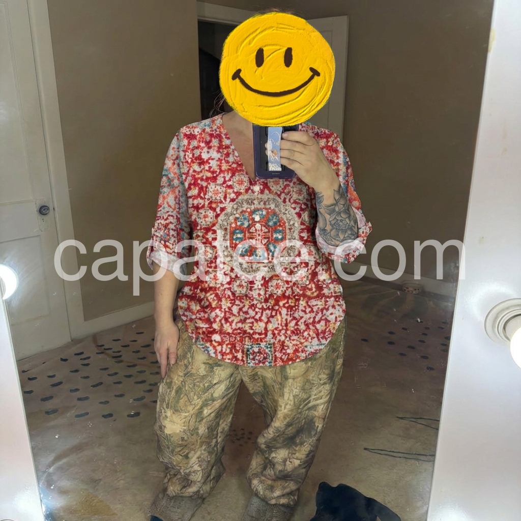 Such a flattering top! The v-neck isn't too deep, and I love that I can roll the sleeves up. I wore it to a casual brunch and got so many compliments on the mandala design.