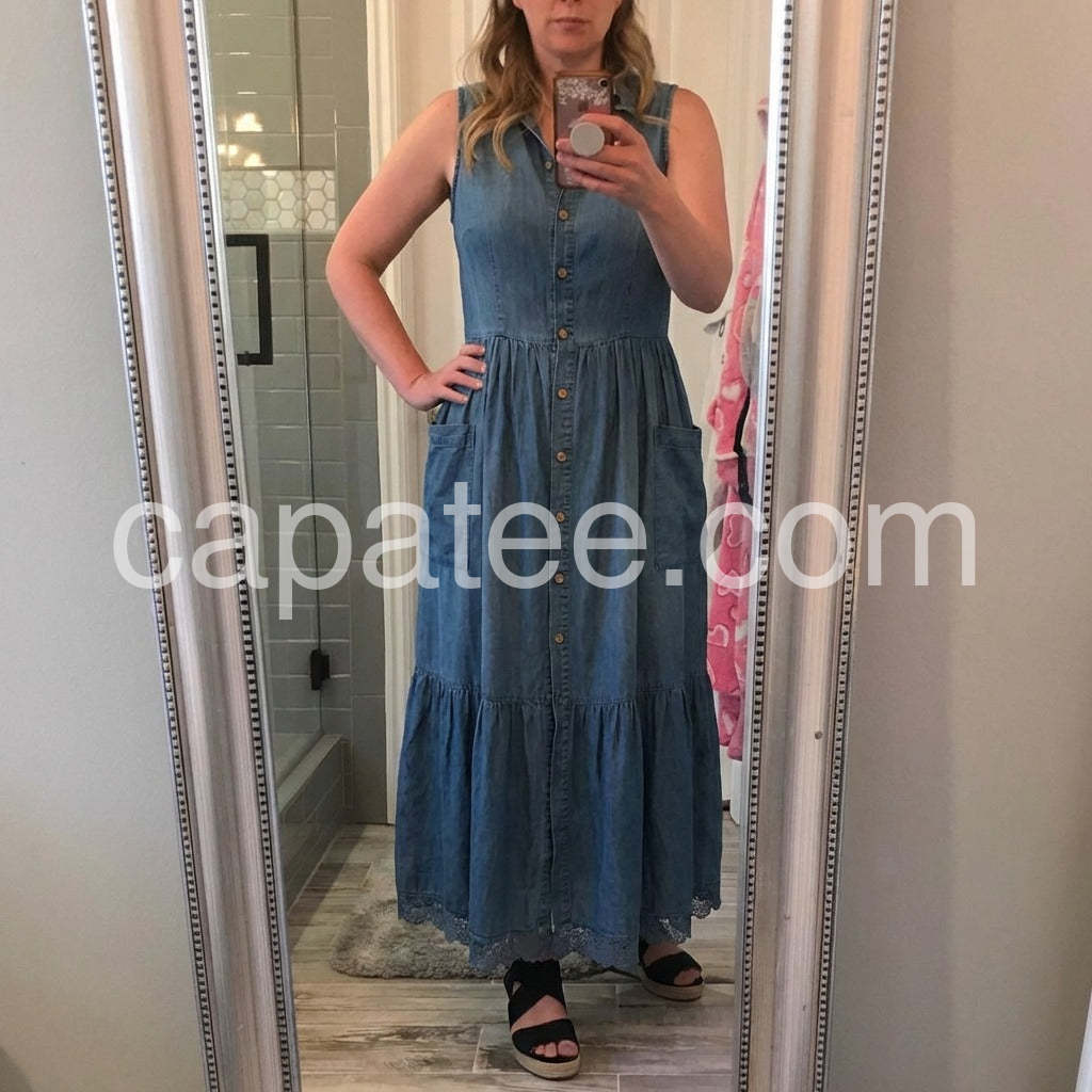 Blue Sleeveless V-Neck Button Front Denim Maxi Dress