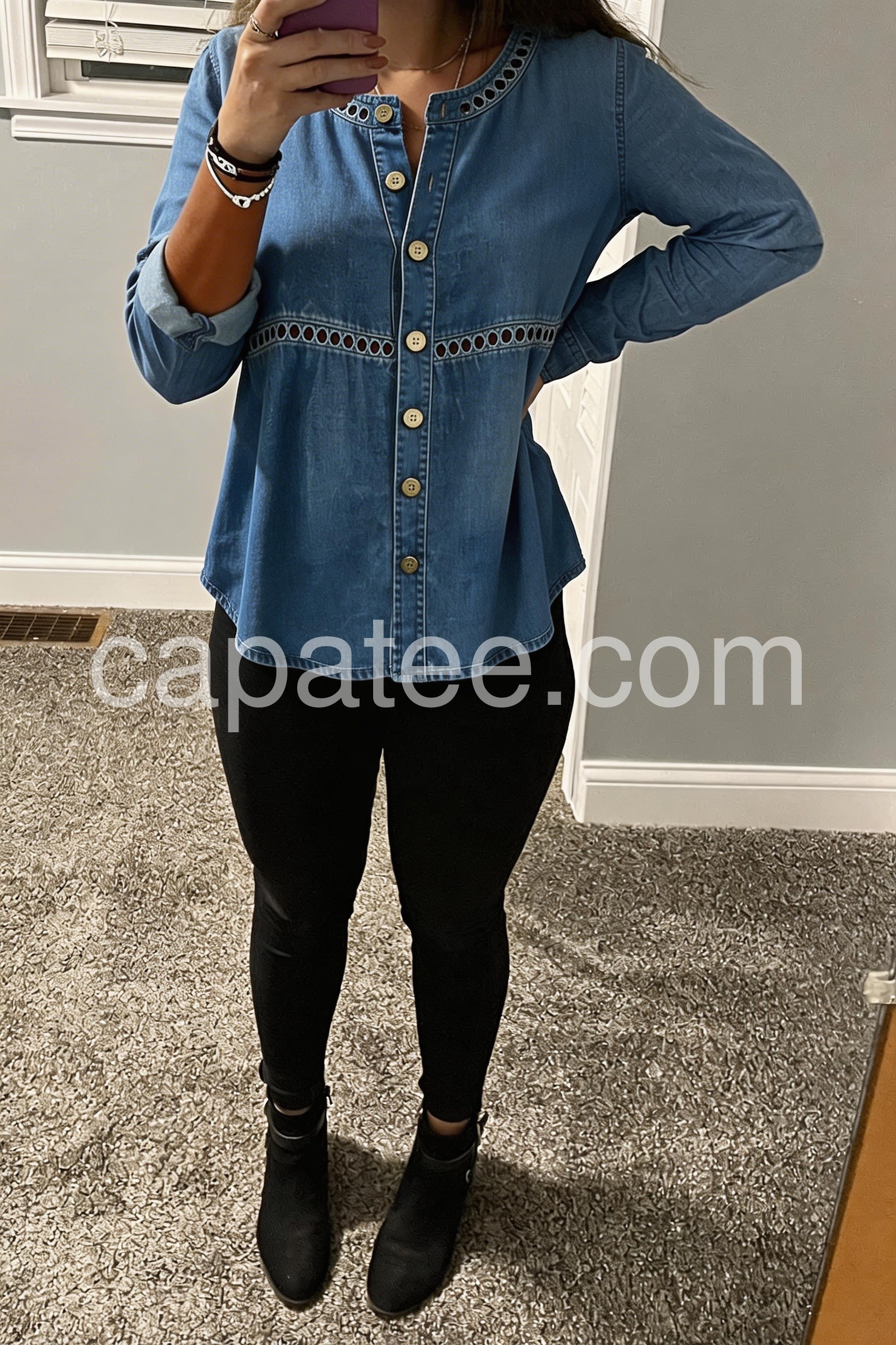 Embrace laid-back elegance in this Blue Denim Button Down Top with Embroidered Trim, a stylish and comfortable piece that blends classic denim appeal with artisanal details. Crafted from soft, medium-wash denim fabric, this tunic features a relaxed, oversized silhouette with a flattering round neckline and front button closure, offering both ease and timeless charm. The standout design element is the decorative embroidered trim—featuring a delicate dotted pattern—accenting the neckline and waistline, adding a touch of boho flair and texture. Styled here with layered necklaces, bracelets, and distressed denim bottoms, it’s ideal for weekend errands, coffee dates, or a leisurely walk through the city.