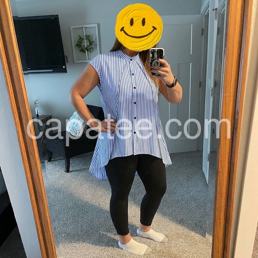 I love the dramatic high-low hem on this blouse. It covers my bum perfectly when I wear leggings, and the vertical stripes are very slimming. Highly recommend!