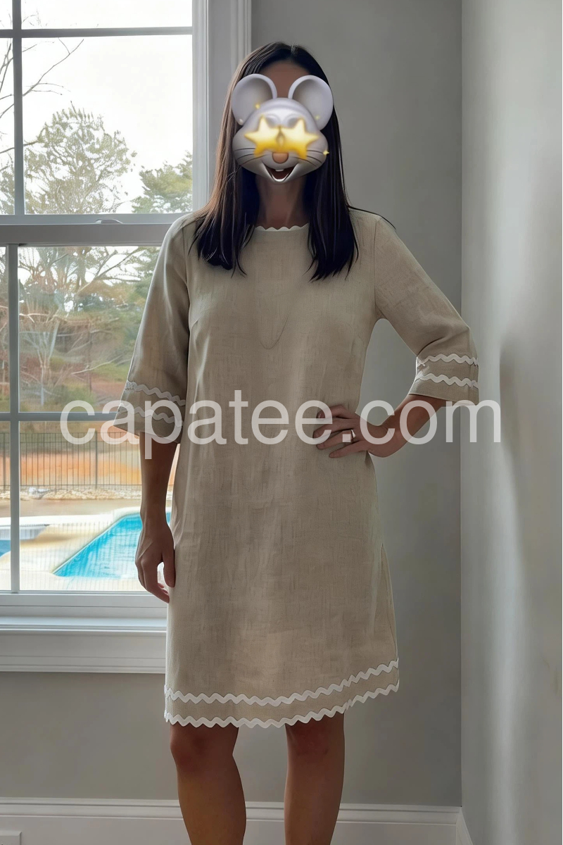 This mid-length dress features a relaxed silhouette with delicate white scalloped trim at the hem and sleeves. Made from lightweight linen for comfort and breathability. Perfect for daytime events or warm-weather occasions. Pair with pearls and heels for a polished look. Timelessly elegant and easy to wear.