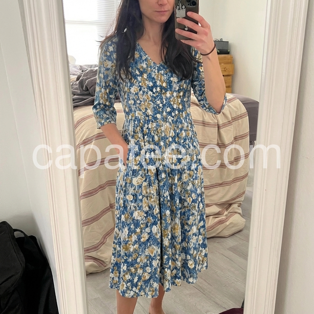 I designed this dress to be a cheerful staple for your wardrobe. The vibrant blue and yellow floral print is eye-catching without being overwhelming, perfect for summer days.