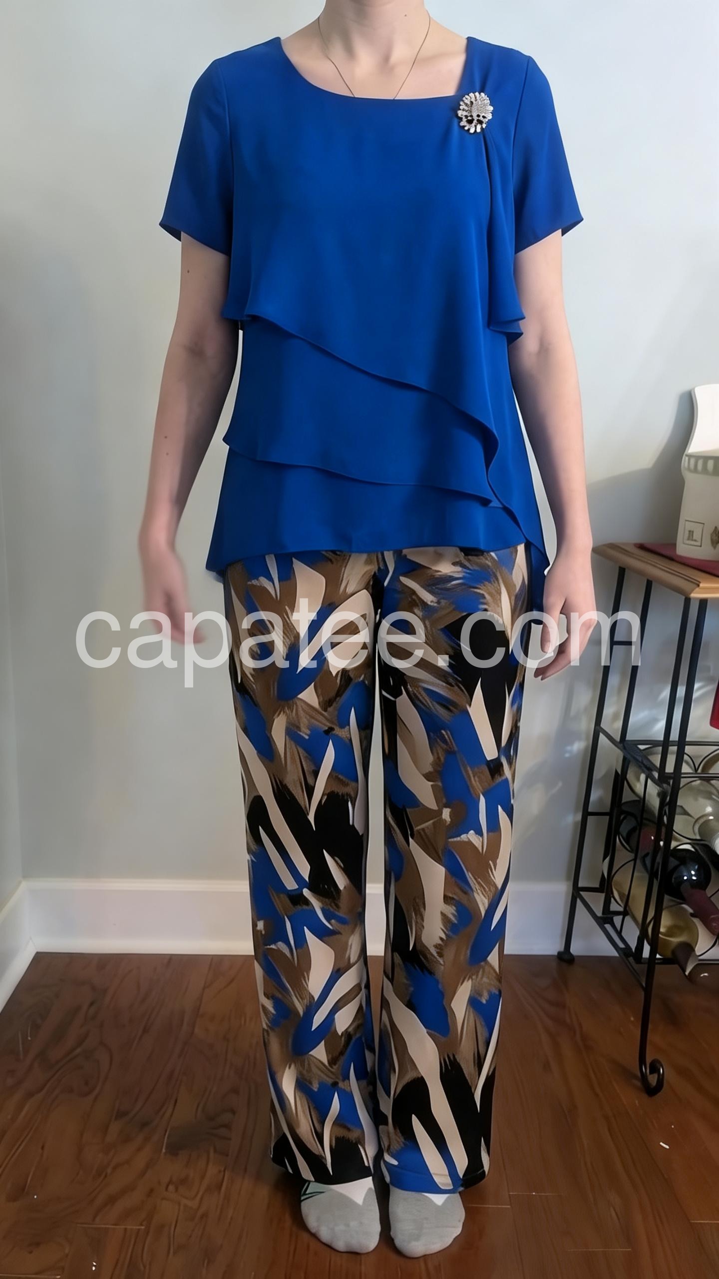 This coordinated set features a vibrant blue top with an asymmetrical layered hem and matching wide-leg pants in a bold abstract print. The combination of solid and patterned pieces creates a stylish contrast. Lightweight fabric perfect for warm weather. Ideal for casual outings or relaxed elegance. Effortlessly chic and fashion-forward.