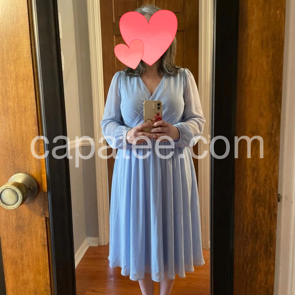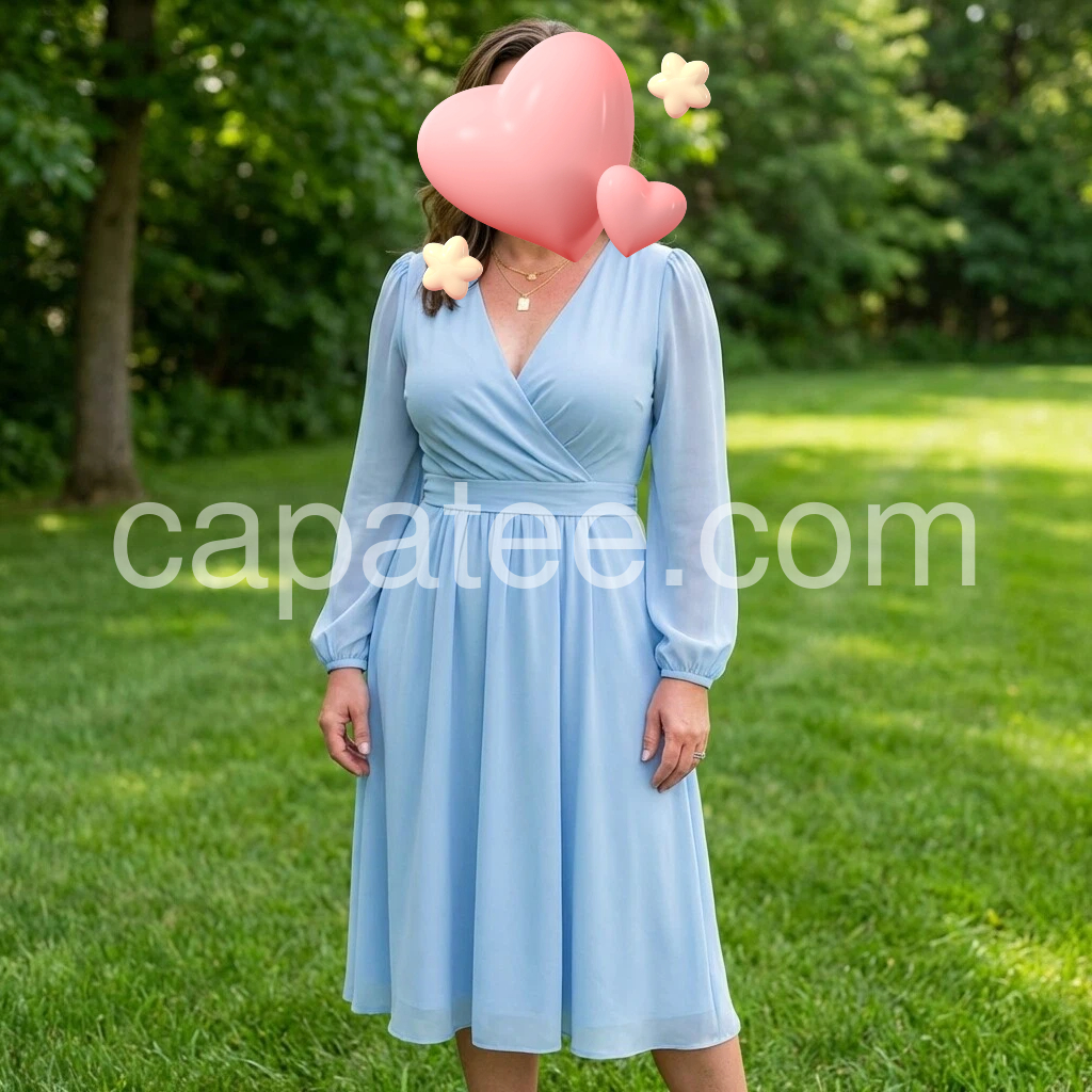 This dress is absolutely beautiful! The light blue color is so pretty and it looks very flattering. I love the V-neck and the long sleeves with a gentle puff—everything feels balanced and elegant. The fabric looks soft and breathable, and the skirt has a nice flow that doesn’t cling. It’s perfect for outdoor days and looks exactly like the photos. Highly recommend!