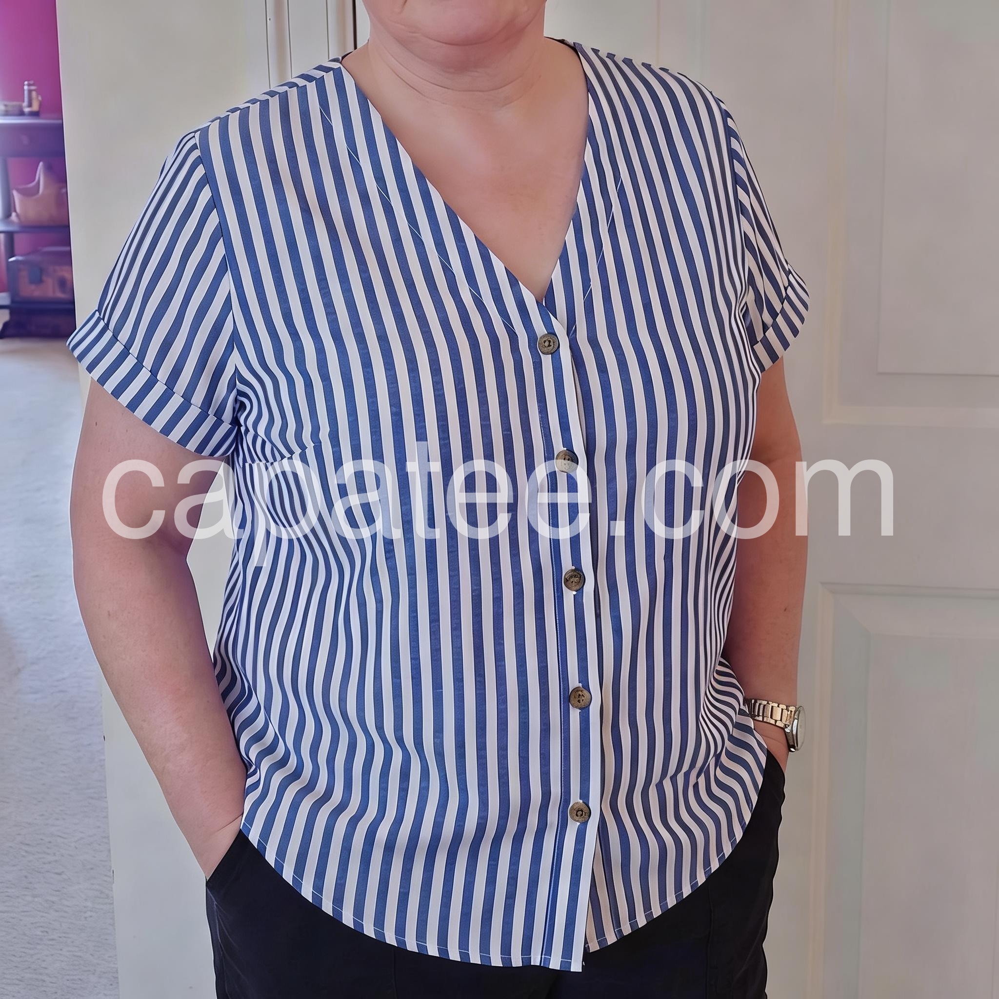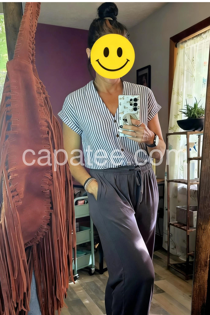 This V-neck top features vertical blue and white stripes with a front button closure. Rolled short sleeves add a relaxed, breezy touch. Lightweight fabric perfect for warm days. Pair with jeans or shorts for a timeless look. Effortlessly chic and easy to style.