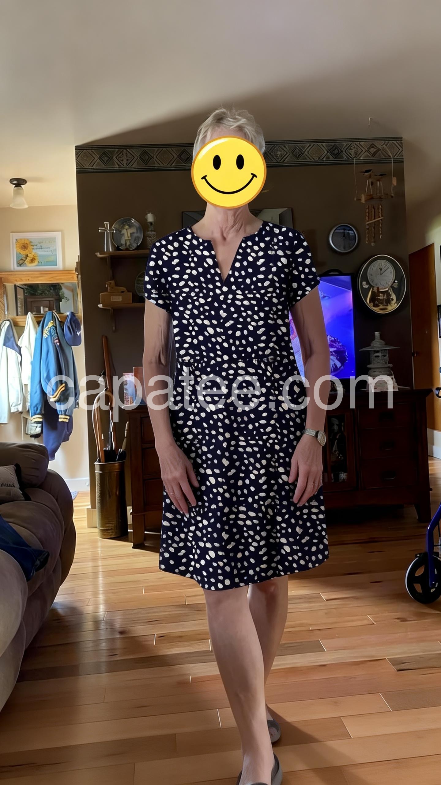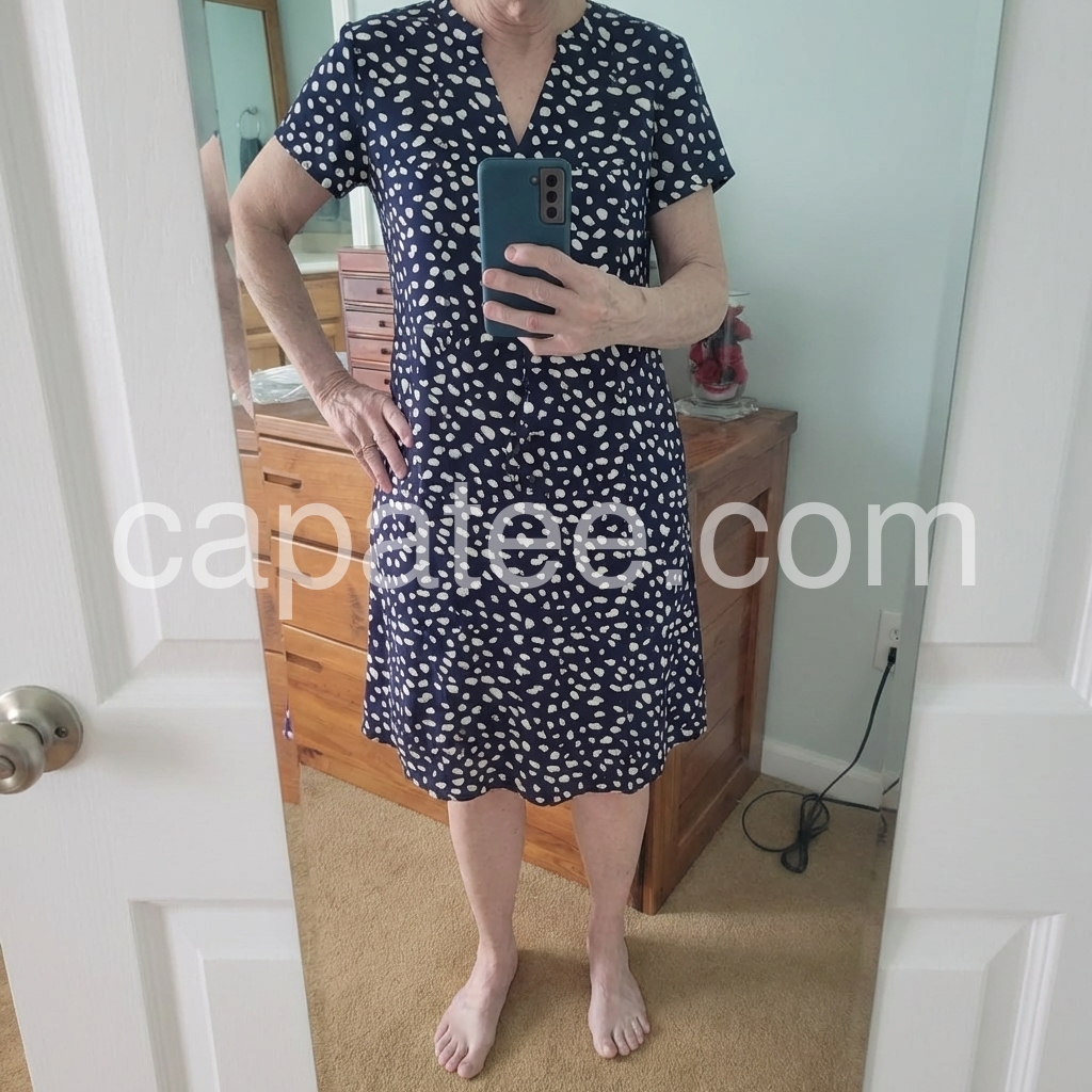 This mid-length dress features a navy base with playful white polka dots and a flattering V-neckline. Short sleeves and a relaxed fit make it perfect for warm days. Lightweight fabric ideal for casual outings or brunch. Pair with heels or sandals for a polished look. Timeless style with a cheerful touch.