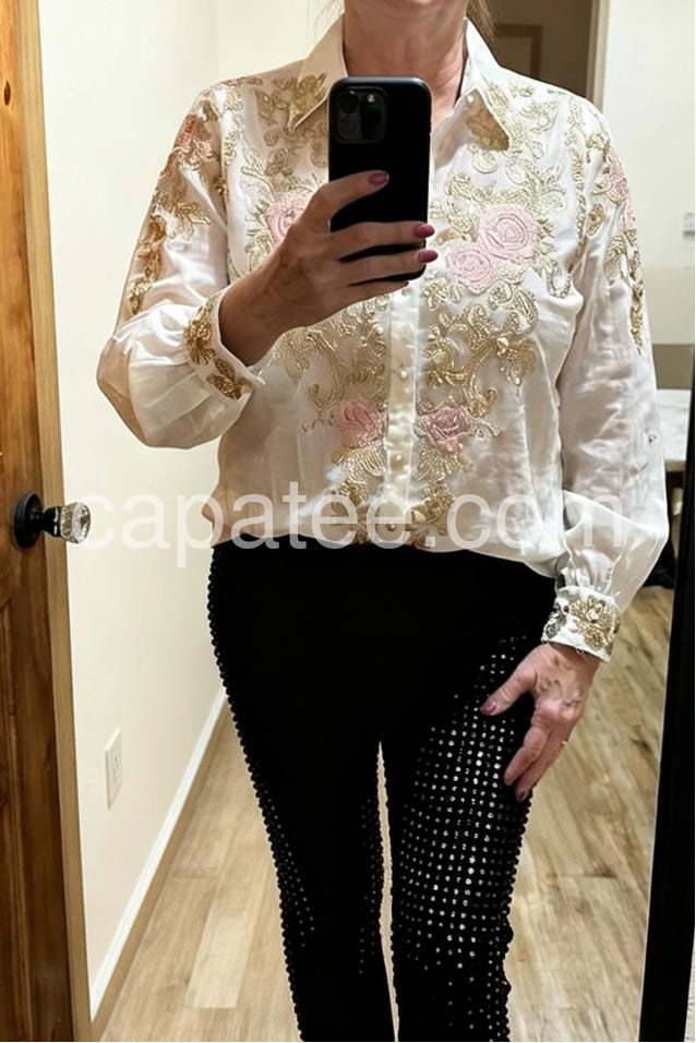 Beautiful crisp white shirt with stunning pastel pink roses. It elevates any outfit instantly. The fabric does not wrinkle easily, which is a huge plus for me. So happy with this purchase.