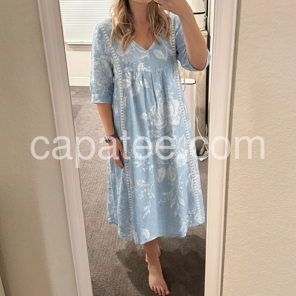 I absolutely love this dress! The light blue color is so pretty for spring, and the white floral pattern gives it a great boho vibe. Best part? It has pockets! The fit is loose and very forgiving, making it incredibly comfortable for all-day wear.
