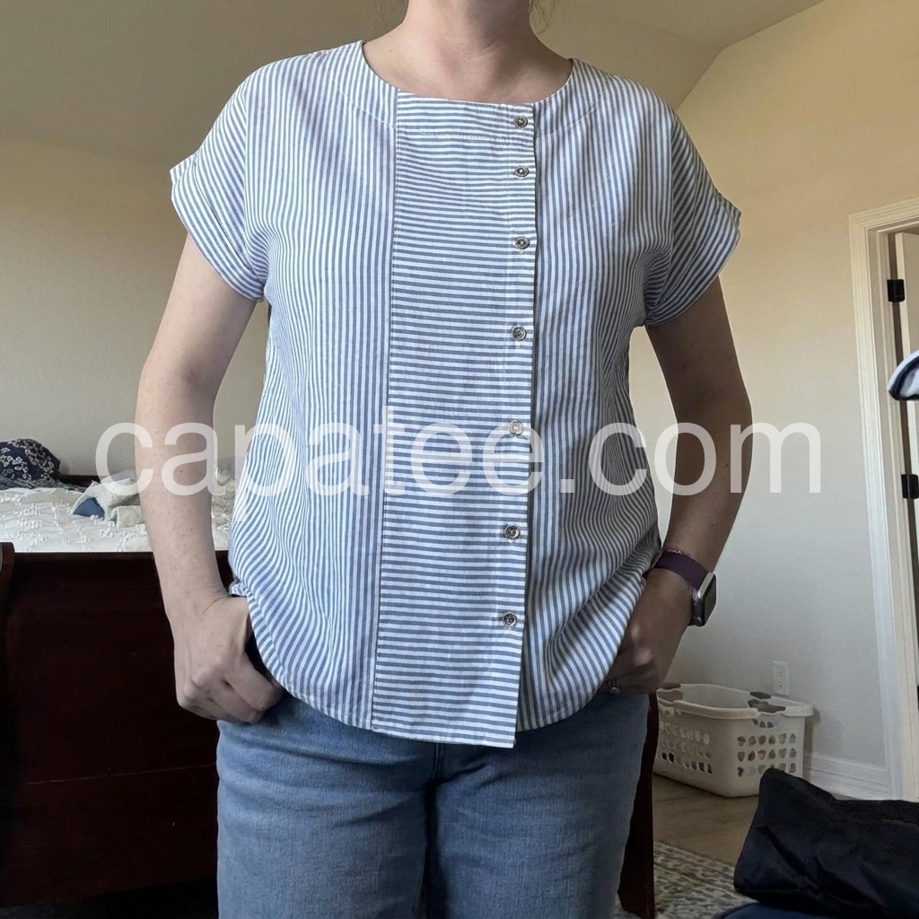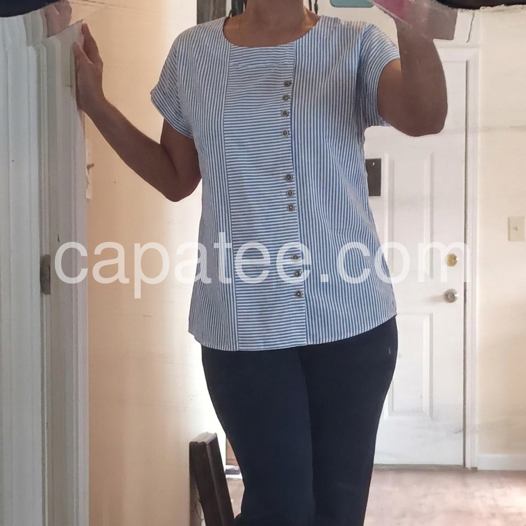 I designed this blouse to fix the "ill-fitting striped top" pain point. The vertical stripe panel slims the torso, while the side buttons add a modern twist to a classic design.