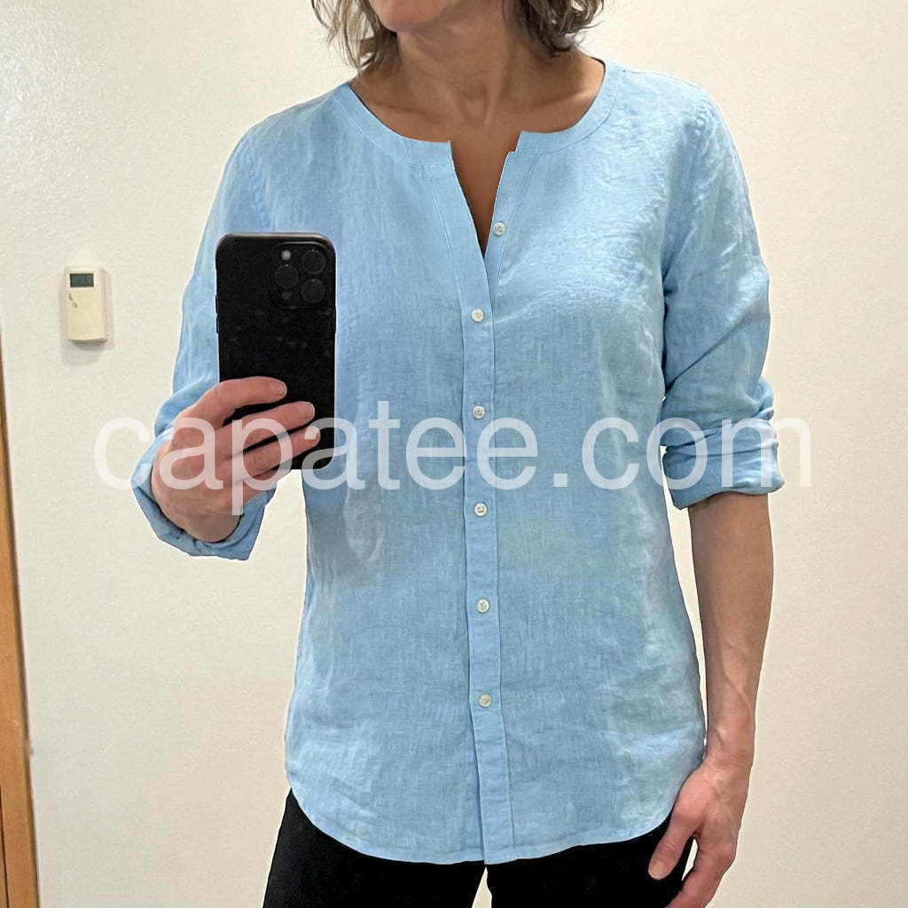 Soft Blue Linen-Blend Button Up Blouse
