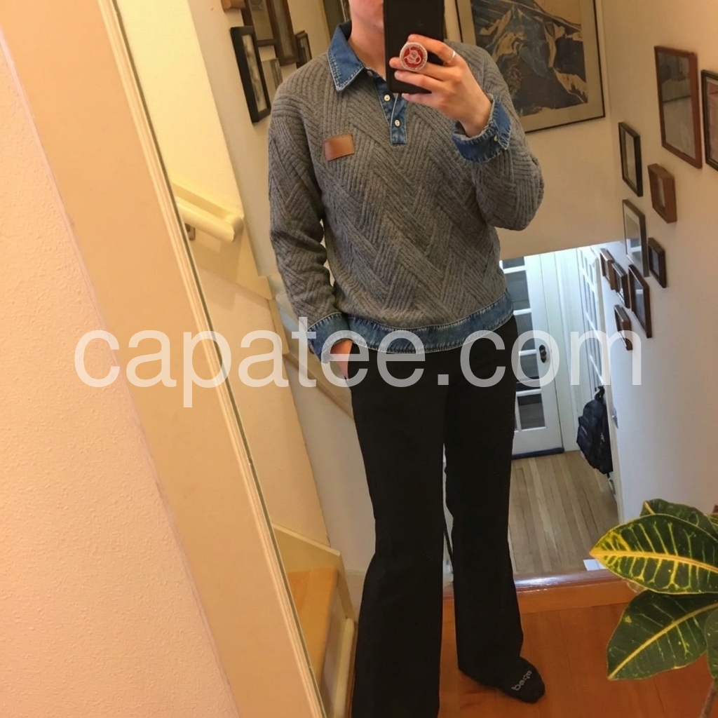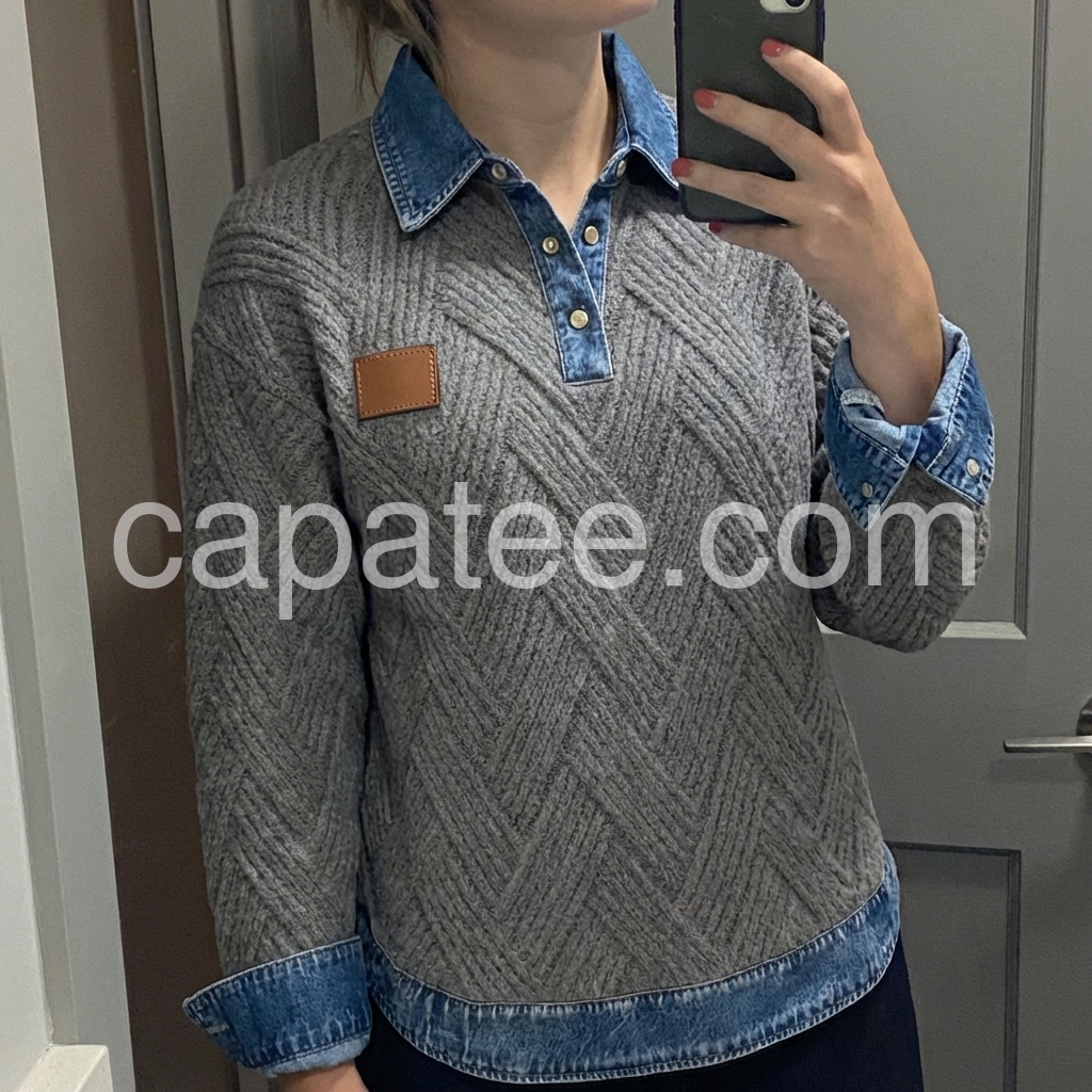 Elevate your casual wardrobe with this sophisticated grey herringbone knit sweater, featuring a distinctive denim collar that bridges the gap between refined knitwear and relaxed styling. The herringbone texture adds visual depth and dimension, while the contrasting denim collar provides a contemporary edge perfect for layering or wearing standalone. Crafted for versatility, this piece transitions seamlessly from weekend wear to smart-casual settings, offering both comfort and polished appeal.