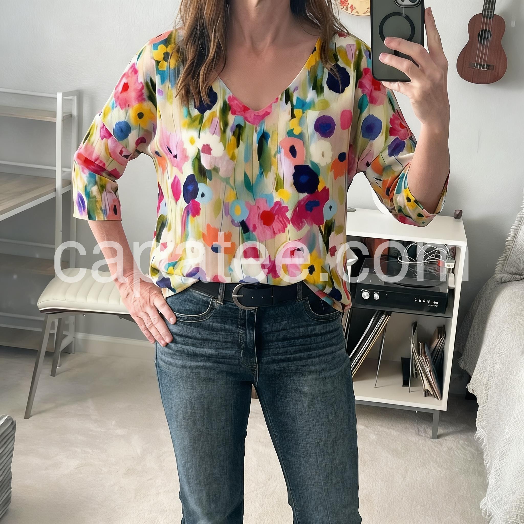 This flowy top features a colorful watercolor floral print on a soft beige base. Deep V-neckline and three-quarter sleeves with rolled cuffs. Lightweight fabric perfect for warm weather. Ideal for casual wear or beach outings. Effortlessly stylish and full of summer spirit.