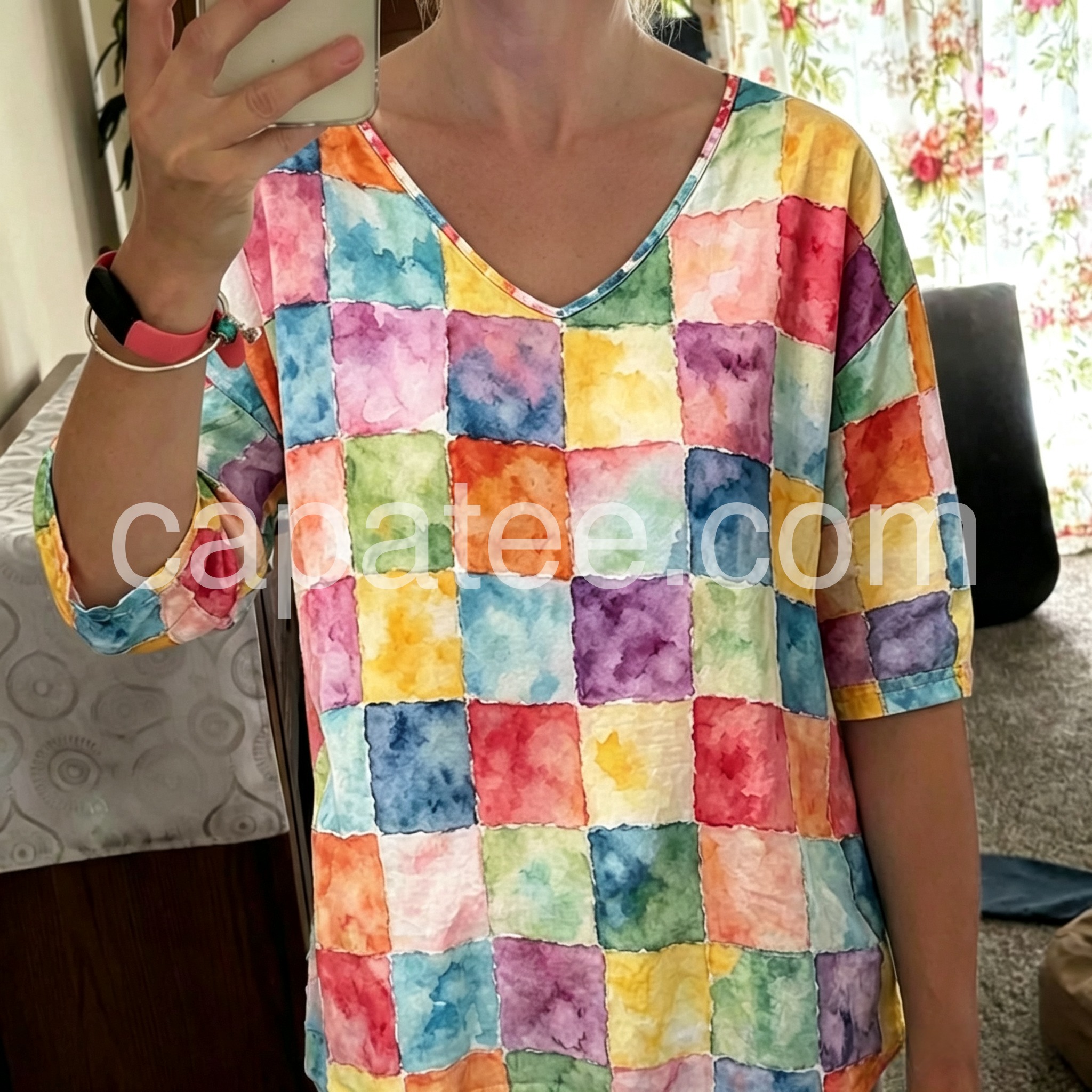 Watercolor Checkerboard Dolman Sleeve V-Neck Top