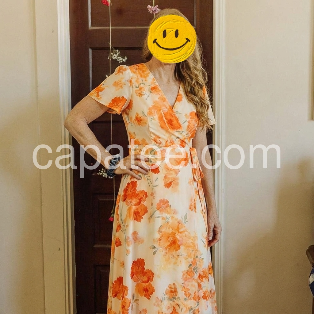 Beautiful summer dress. The orange flowers are so pretty and cheerful. I wore this to a summer wedding and it was lightweight enough to keep me cool during the outdoor ceremony, yet elegant enough for the reception. Five stars!