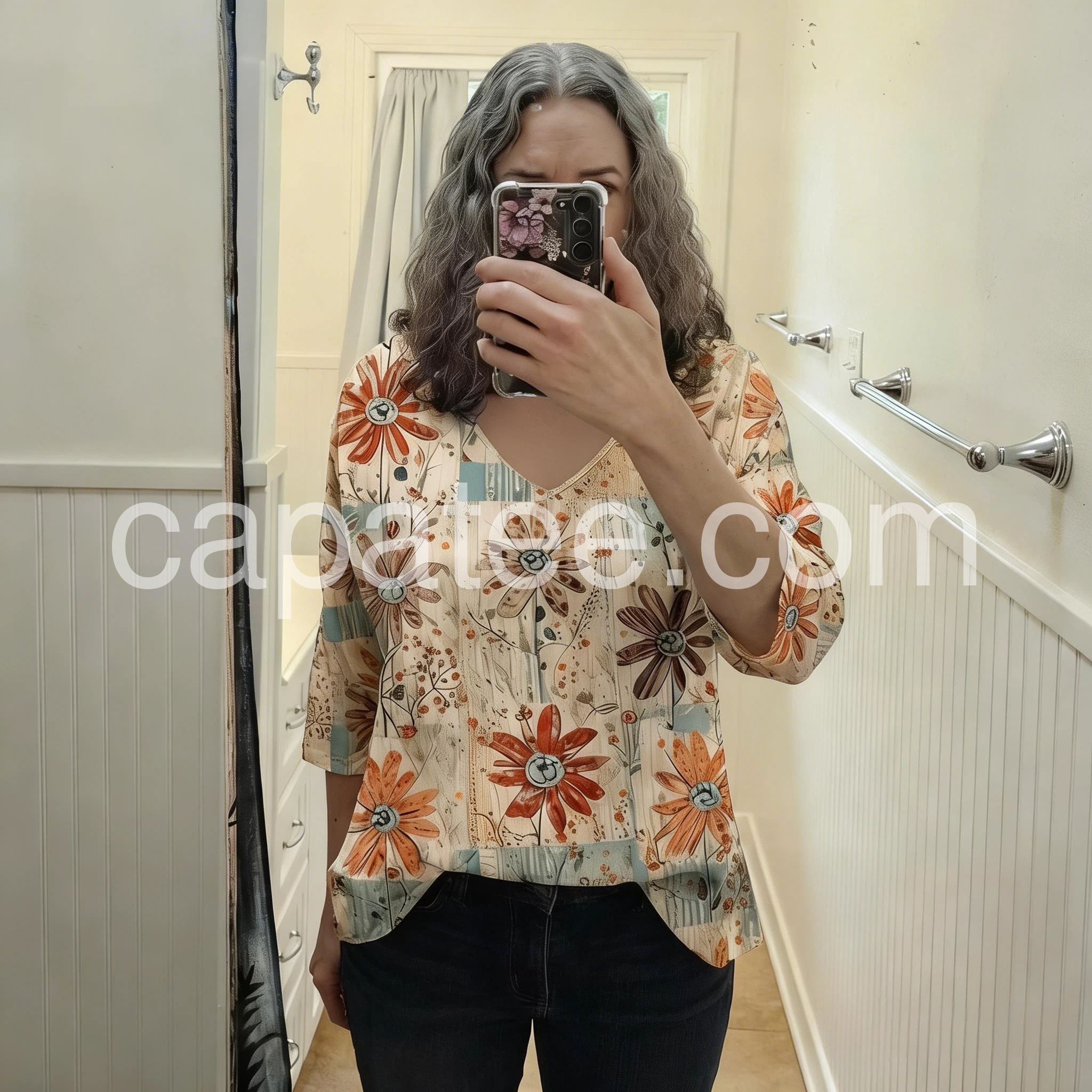 Patchwork Floral Print V-Neck 3/4 Sleeve Blouse