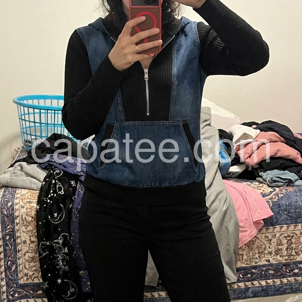 For me, this top is the perfect blend of casual and trendy. The denim panel gives it a cool, everyday vibe, and the black ribbed sleeves make it stand out without being too flashy. I wore it once and received compliments immediately. It’s comfortable around the arms, and the overall fit feels flattering and easy to move in.