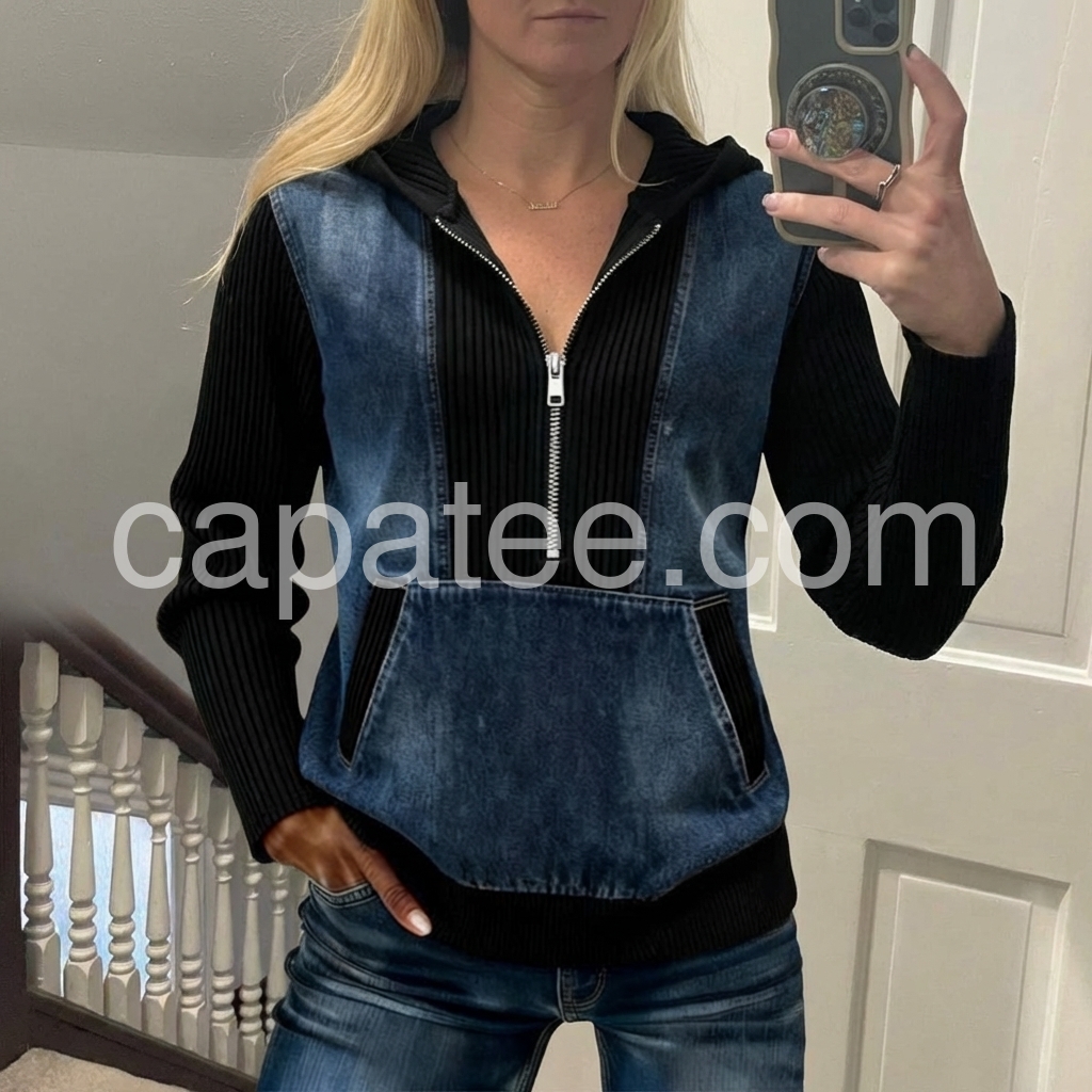 This is one of those tops that instantly upgrades your outfit. The denim front with the black ribbed contrast feels fashion-forward, and the fit looks great both for lounging and for running errands. I also love that it’s easy to layer—perfect with a tank underneath or a simple tee.