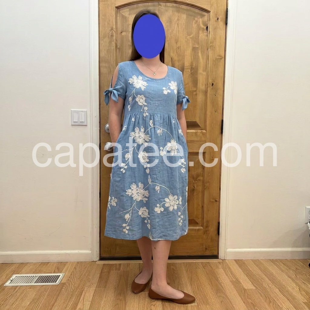 Designed to fix the "boring summer dress" pain point, this dress features intricate floral embroidery that elevates basic linen. The tie sleeves solve the "arm fat" concern, while the flowy tiered hem skims over hips and thighs.