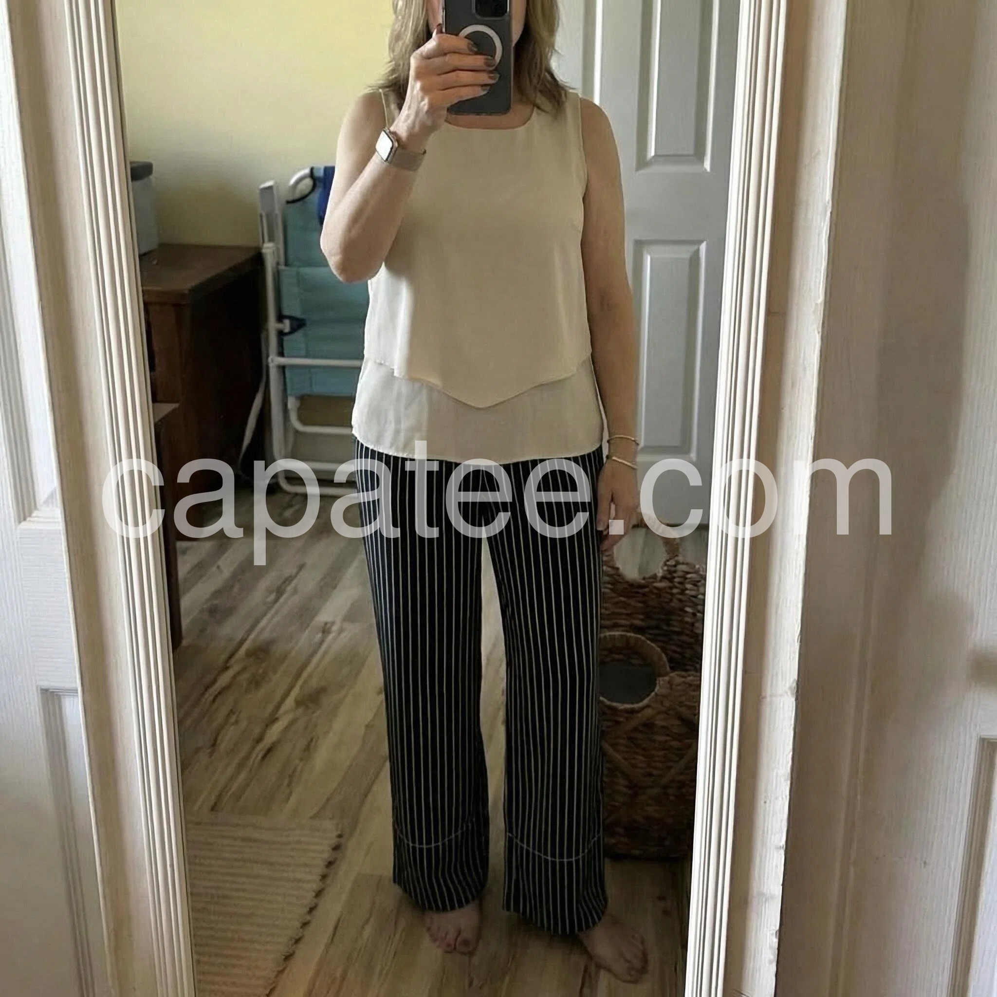 This two-piece set features a sleeveless beige top with a layered hem and square neckline. Paired with high-waisted black wide-leg pants in thin white stripes. Comfortable fit with a chic, relaxed silhouette. Perfect for casual outings or smart-casual events. Effortlessly stylish and easy to wear.