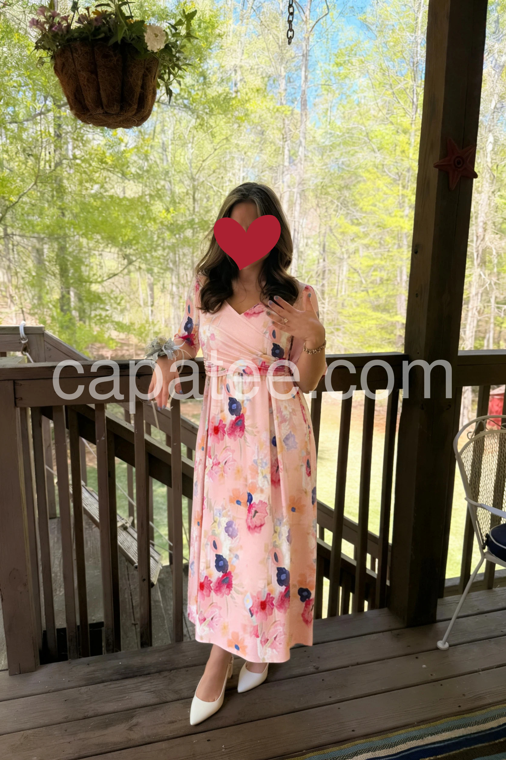 This midi dress features a soft pink base with vibrant floral prints. The V-neck and short sleeves offer a feminine touch. Side pockets add practicality and ease. Lightweight fabric perfect for spring or summer days. Ideal for casual outings or garden parties.