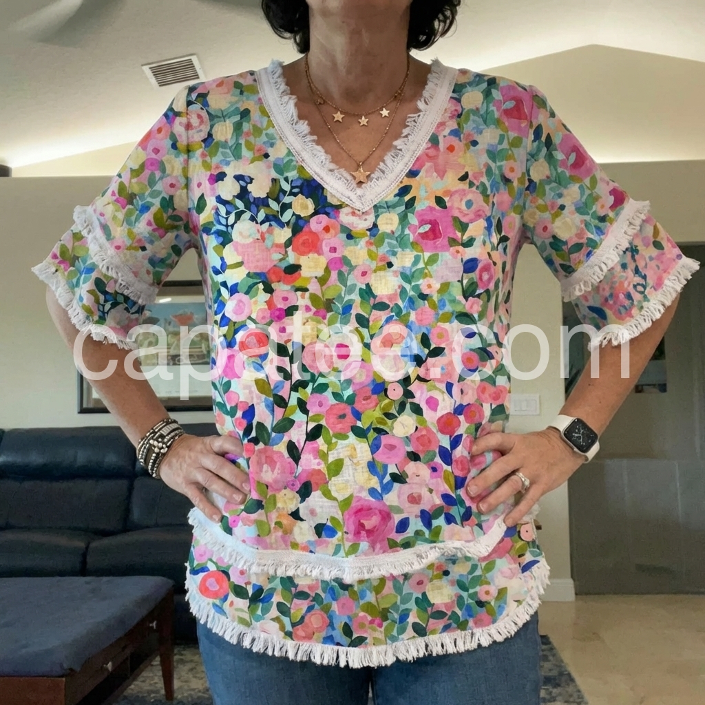Five stars! This shirt exceeded my expectations. The fabric has a nice texture to it and the fringe trim is securely attached. It is so comfortable I want to wear it every day.