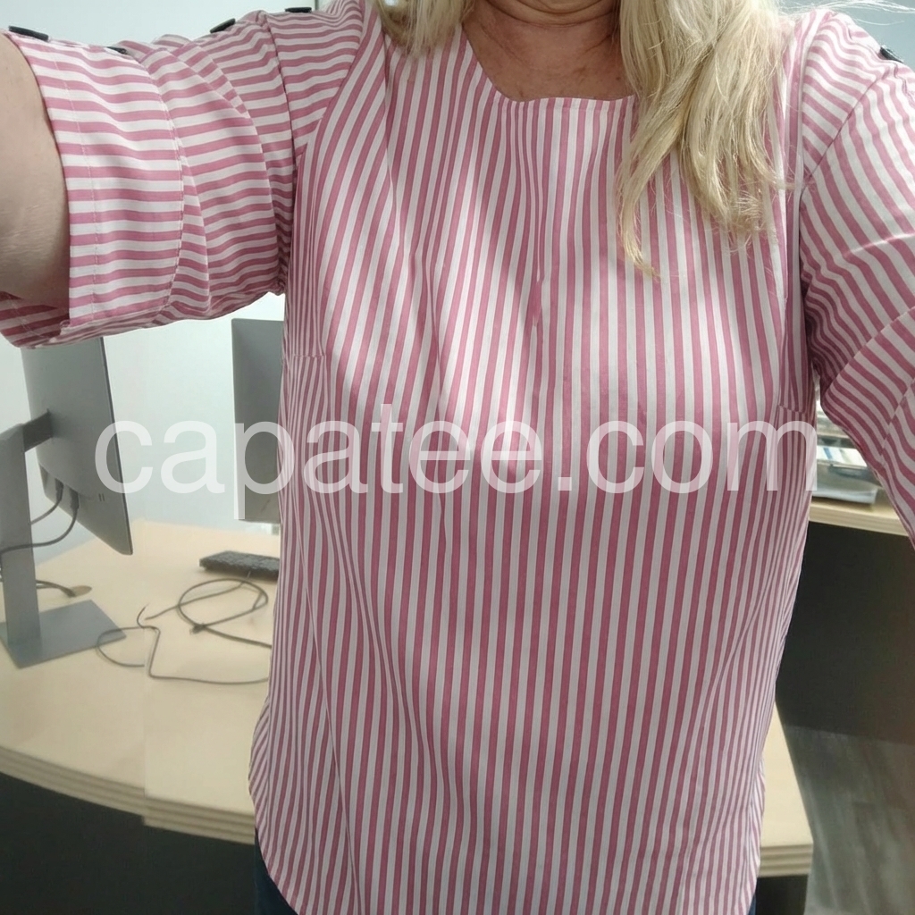 his loose-fit top features vertical pink and white stripes with stylish button details on the sleeves. Three-quarter sleeves with rolled cuffs offer a relaxed look. Round neckline for a clean, comfortable fit. Perfect for casual wear or smart-casual outfits. Bright and cheerful with a touch of elegance.