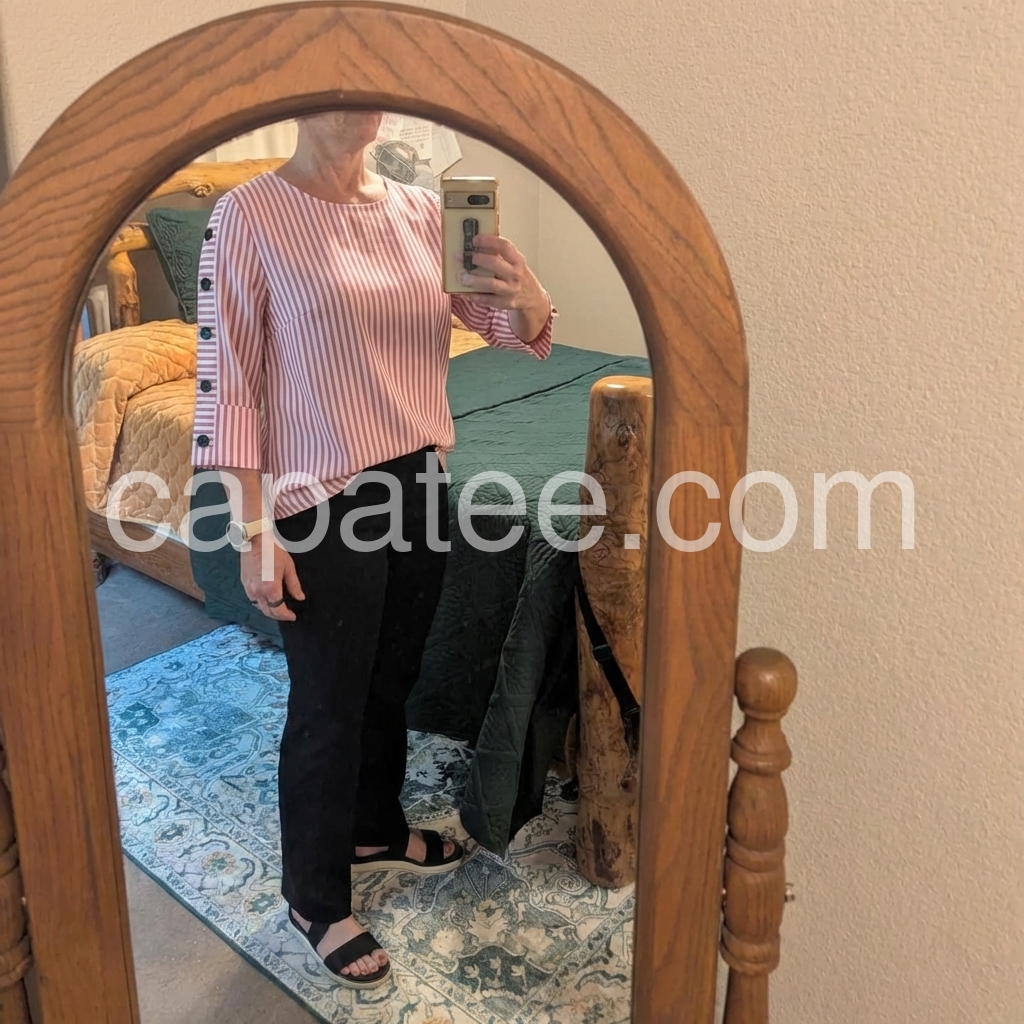 Very flattering cut! It hides my tummy perfectly without looking like a maternity shirt. The 3/4 sleeves are exactly what I wanted.