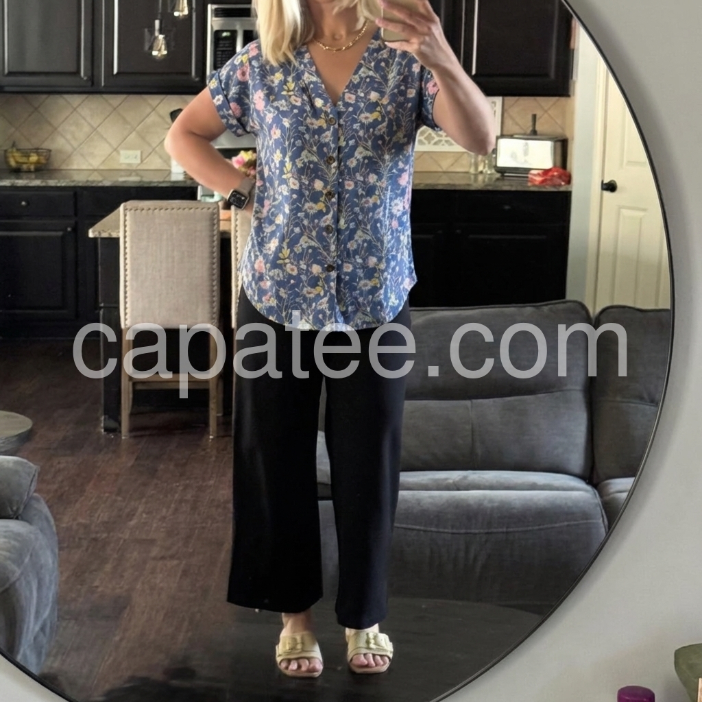 This short-sleeve V-neck blouse features a delicate floral print on a deep navy background. The button-down front adds a polished touch. Lightweight fabric perfect for warm weather. Pair with jeans or skirts for effortless style. Ideal for casual outings or spring days.