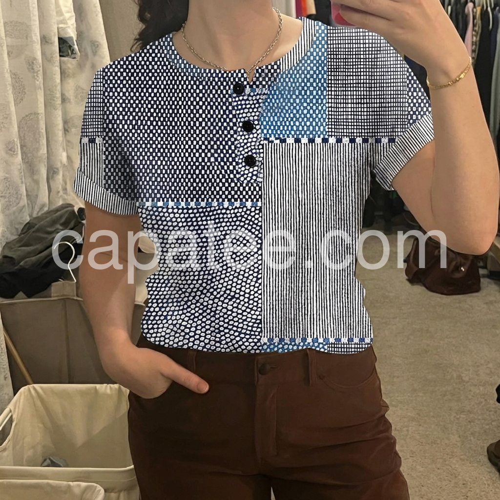I absolutely love the patchwork design on this top! It is so unique with the mix of stripes and polka dots. The fit is true to size and very flattering. Perfect for casual Fridays at work or a weekend outing.