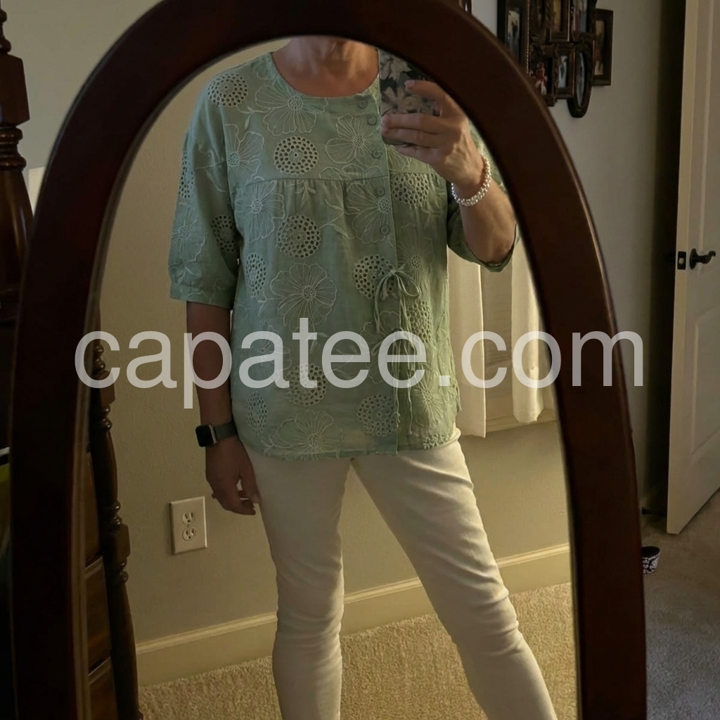 Created to refresh everyday basics, this embroidered blouse solves the problem of “boring work tops” with delicate floral cutwork. The intricate embroidery adds texture and visual interest, elevating simple jeans or trousers.