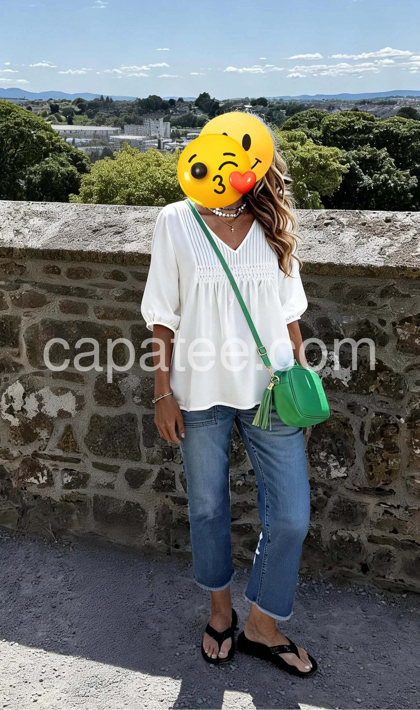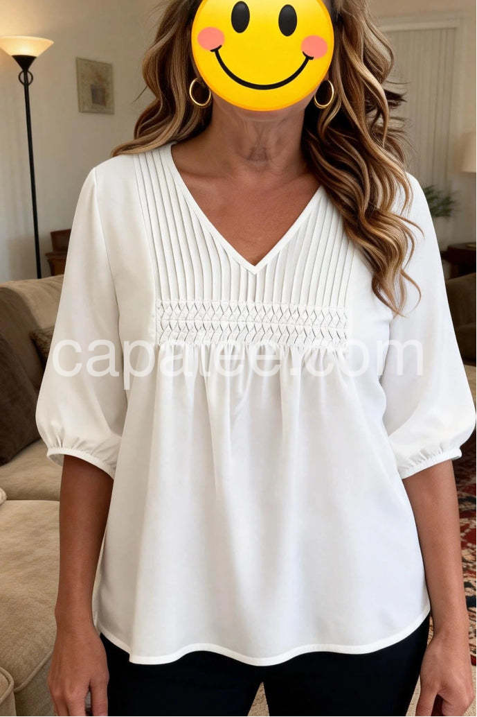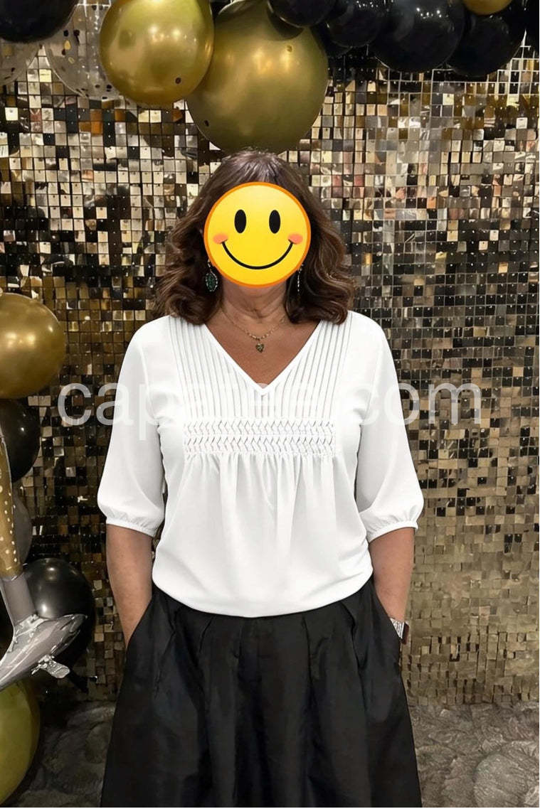 This white blouse is absolutely perfect for both work and casual weekends. The v-neck is flattering without being too deep, and the pleated details add a really nice touch. It fits true to size and flows beautifully.