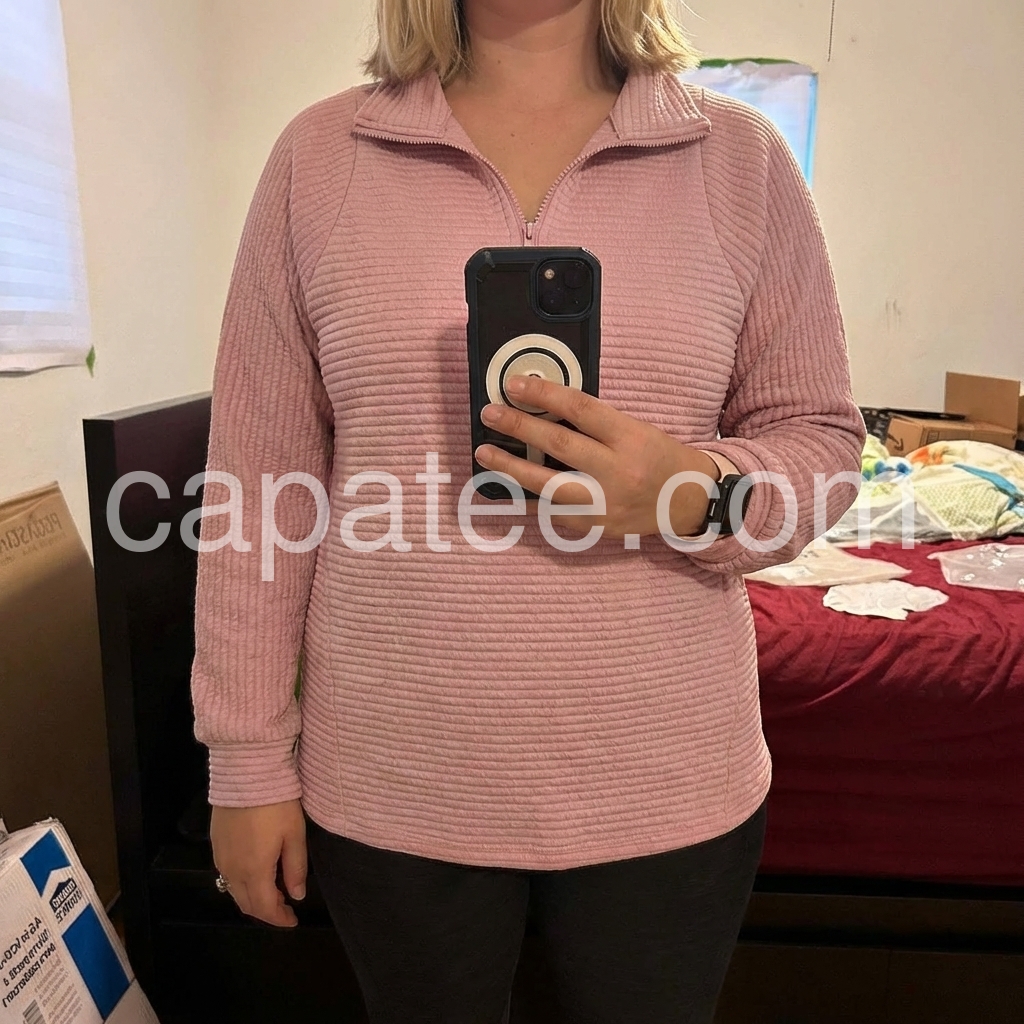This dusty pink half-zip sweatshirt is my new favorite casual piece! The ribbed texture feels so soft and structured, not bulky at all. The quarter-zip neckline is perfect for adjusting warmth, and the relaxed fit drapes beautifully over jeans. I wore it all day running errands and it stayed comfortable, no scratchy fabric. The muted pink is such a chic, wearable color—goes with everything in my closet!