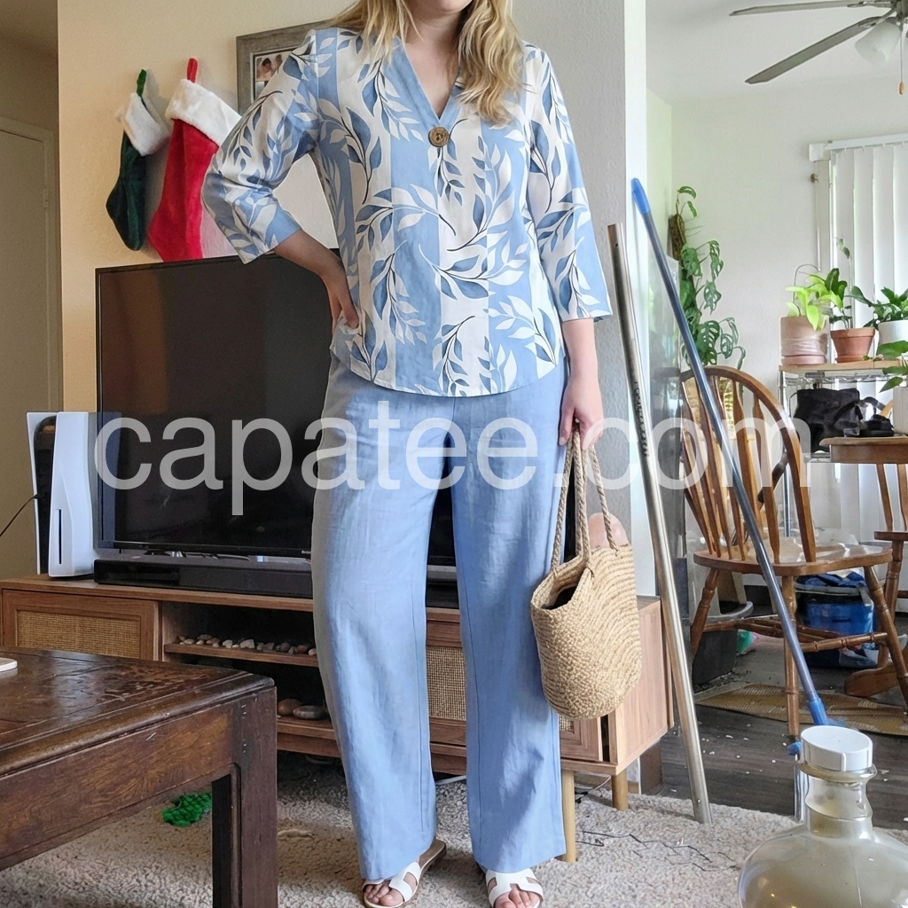 Hey fashionistas! This two-piece set is a total game-changer. The V-neck top with blue and white prints is super flattering, while the three-quarter sleeves add a touch of elegance.
