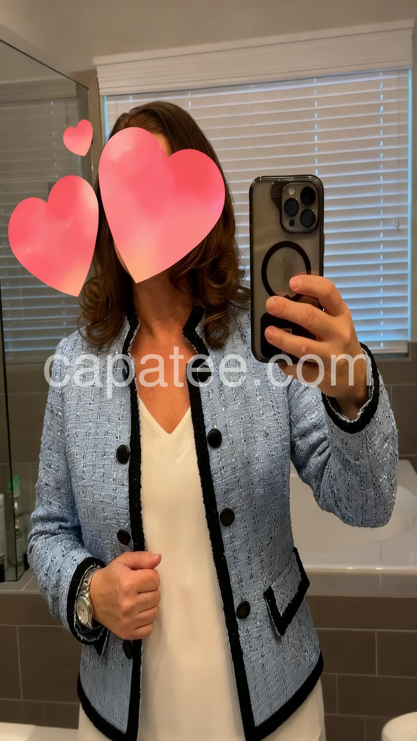 This jacket is even better in person. The fabric has a nice bouclé-like texture and the black edging makes it look polished. The buttons are sturdy and the cut looks great—easy to throw on and instantly elevate an outfit. I wore it out for errands and it felt comfortable all day. It matches the listing photos perfectly and I’m very happy with it.
