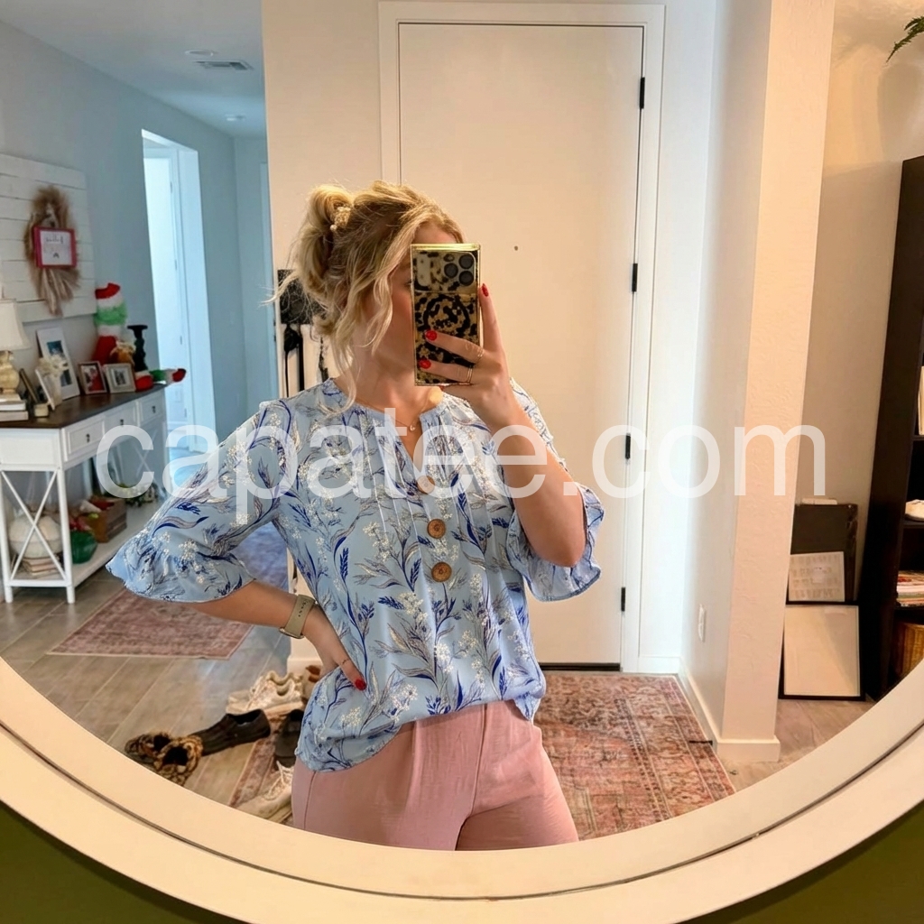 I get so many compliments every time I wear this blouse. The ruffled sleeves are a beautiful touch, and the wooden-style buttons give it a nice rustic vibe. Very comfortable for all-day wear.