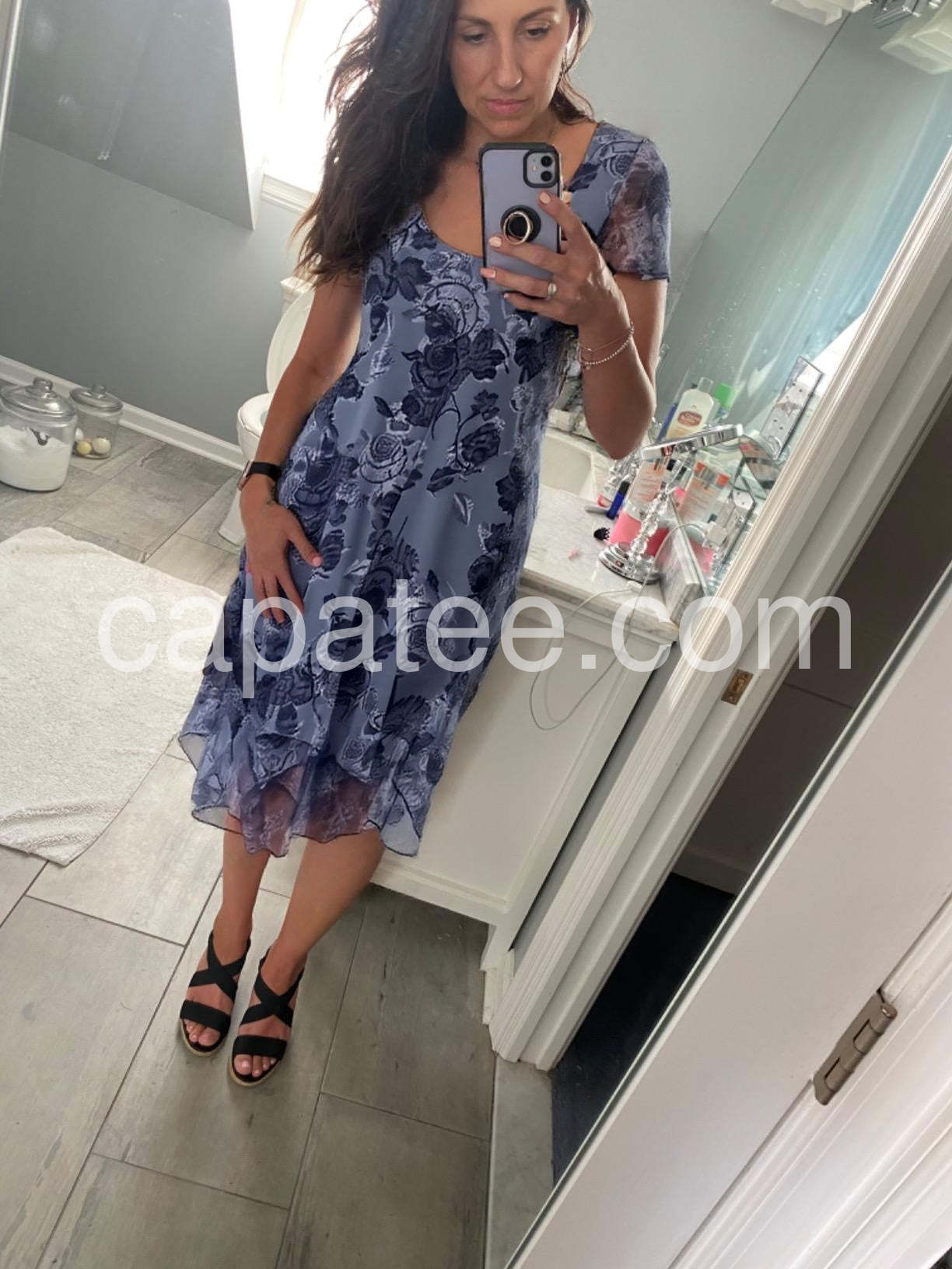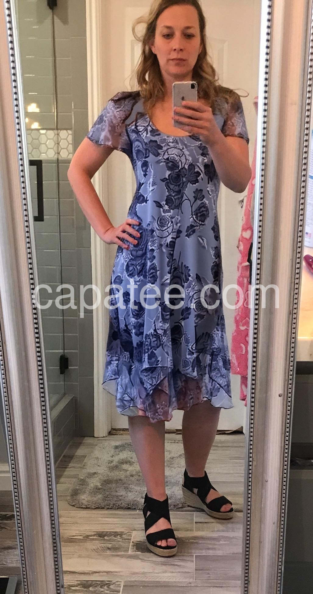 As a mature woman, it is hard to find dresses that are stylish, comfortable, and have an appropriate length. This dress hits all the marks. The scoop neck is not too low and the sheer overlay gives it a very classy look.
