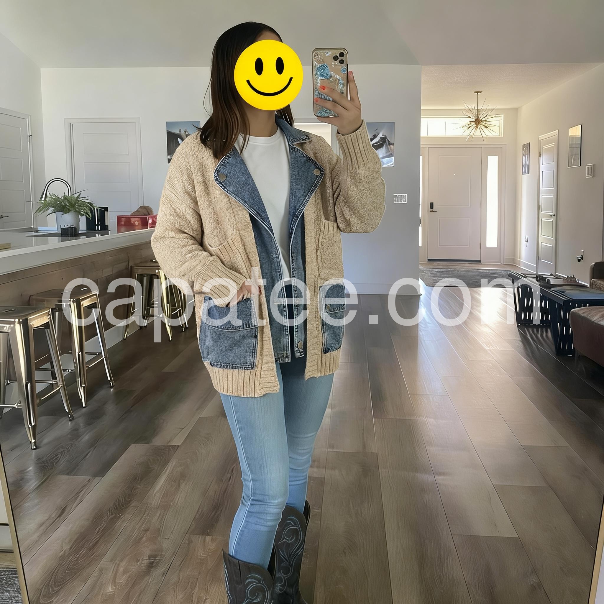 This jacket is a fun addition to my wardrobe! The look is unique with the combination of sweater and demin. The jacket is quite warm and perfect for throwing over a T-shirt and walking the dog on cool days. It is casual, but would also be fine for running to the store or grabbing coffee with a friend. Could be dressed up a little bit with a blouse underneath and a boho necklace. Whenever I put this on, I feel warm and cozy. That's the best part!