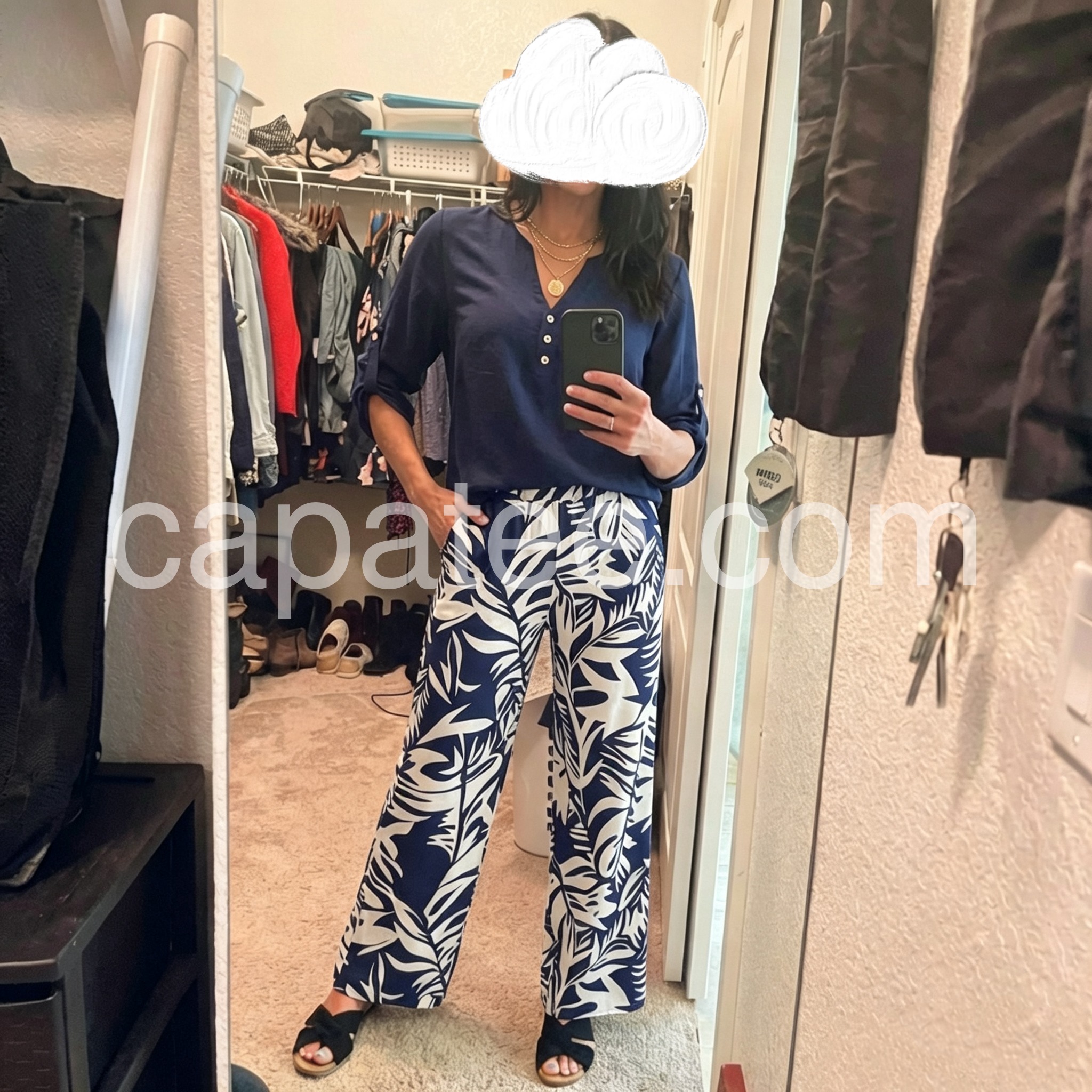 I bought this set for my upcoming cruise and it is absolutely perfect! The navy blue top is so lightweight and the leaf print on the pants gives off major tropical vibes. Super comfortable for walking around or lounging.