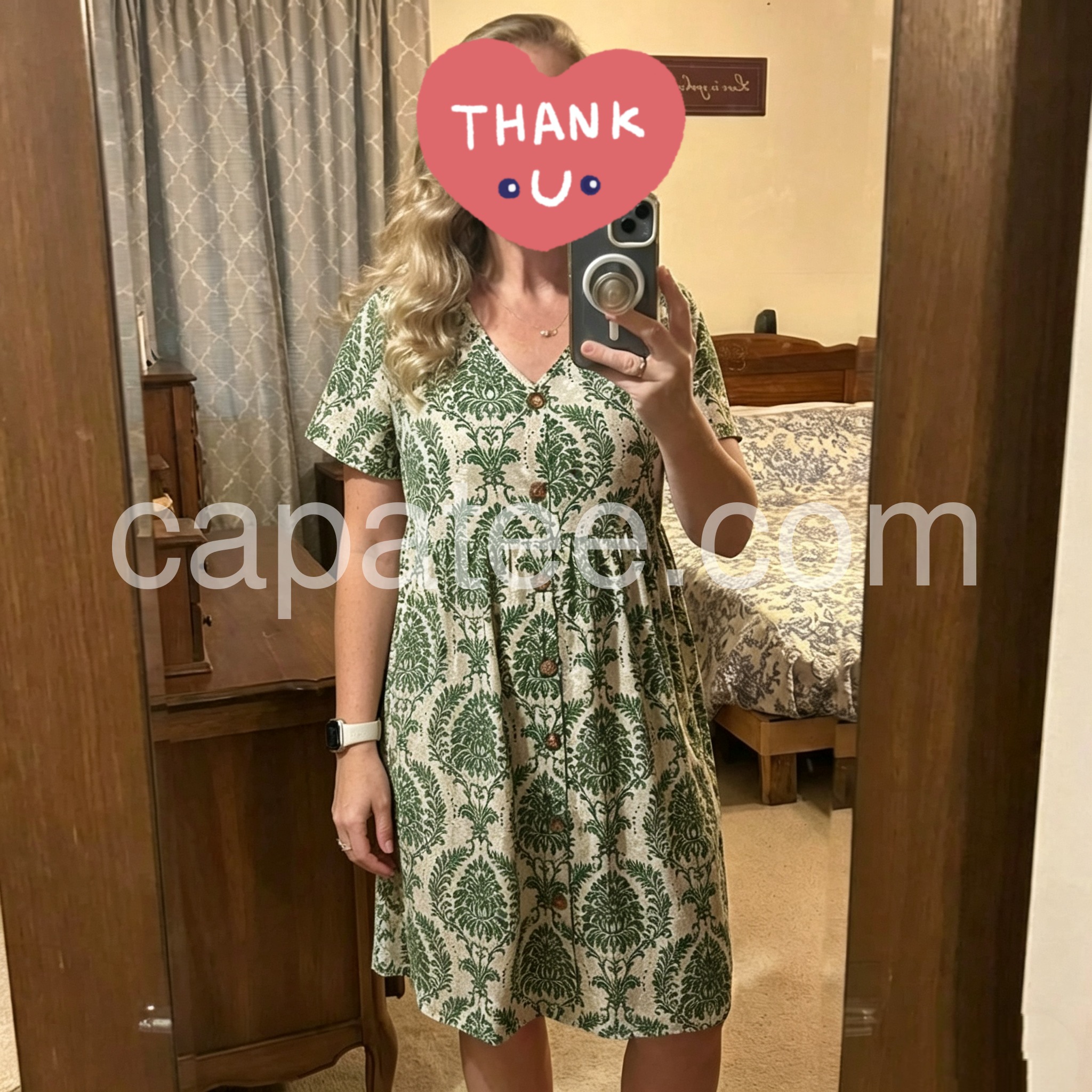 This dress brings vintage-inspired charm to everyday wear. The rich green damask print feels unique and elegant, while the relaxed A-line silhouette skims over curves. The loose fit avoids clinging to midsection areas, making it ideal for casual wear.