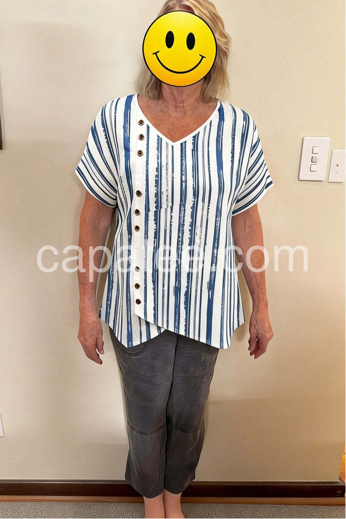 Bring a touch of seaside serenity to your wardrobe with this Nautical White Short Sleeve Striped V-Neck Top, a relaxed and stylish essential for warm-weather days. Crafted from lightweight, breathable fabric—likely cotton or linen blend—this top features a classic nautical-inspired vertical stripe pattern in soft blue and crisp white, with a subtle hand-painted texture that adds artisan charm. The V-neckline offers a flattering frame for the décolletage, while the front button placket in earthy brown tones provides both function and visual interest. Designed with short sleeves and an asymmetrical hem that gently flares at the sides, it creates a breezy, effortless silhouette perfect for layering or wearing solo. Pair it with khaki shorts, wide-leg pants, or denim for a look that’s both casual and chic. Ideal for beach outings, garden parties, or laid-back weekend errands, this top embodies the carefree spirit of coastal living. Inspired by the curated, boho-meets-nautical styles found on Lulus.com, it’s a versatile piece that brings comfort, style, and a hint of ocean breeze to every outfit.