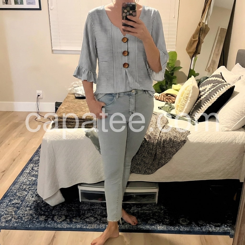 This blouse was created to solve the “boring striped top” problem. The classic grey stripes are updated with a notched V-neck and ruffled three-quarter sleeves, adding feminine charm without being overly frilly.