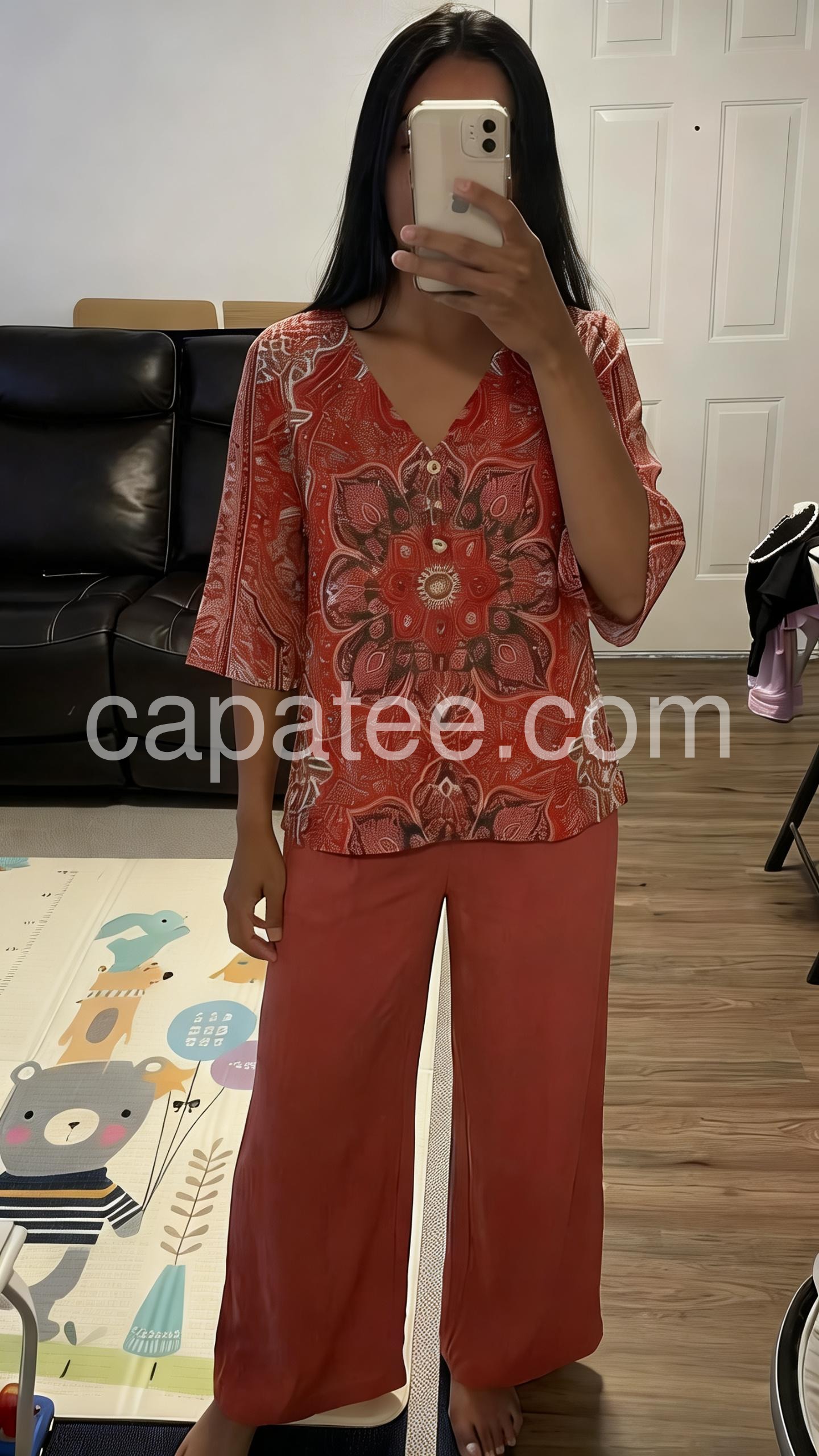 This coordinated set features a V-neck top with a bold mandala print and matching solid wide-leg pants. The relaxed fit ensures all-day comfort. Soft fabric perfect for warm weather. Ideal for casual outings or stylish days out. Effortlessly chic with a bohemian flair.