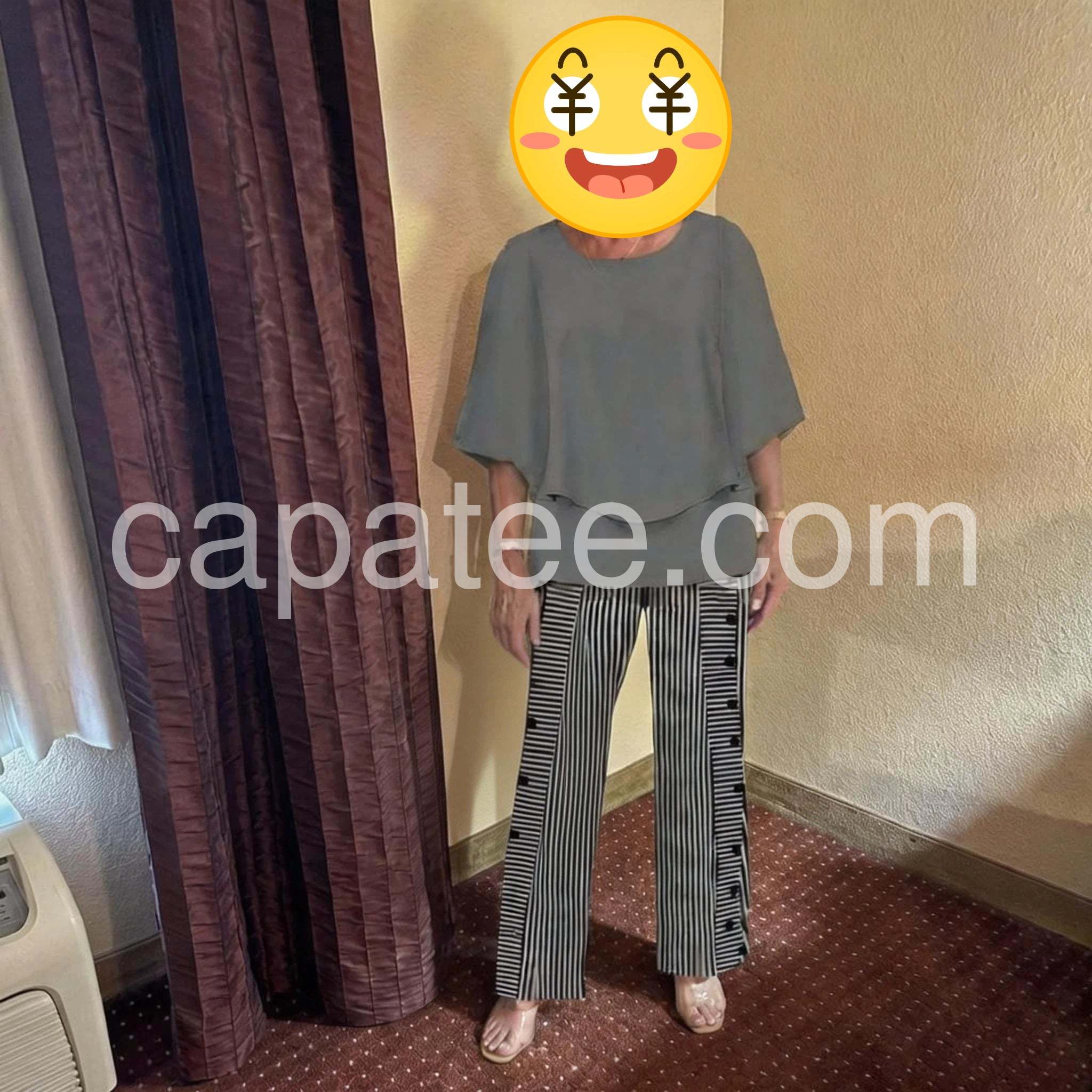 I absolutely love this two-piece set! The grey top is incredibly flattering and hides any tummy imperfections with its layered design. The striped pants are so stylish with the side buttons. Highly recommend for a comfortable yet chic look.