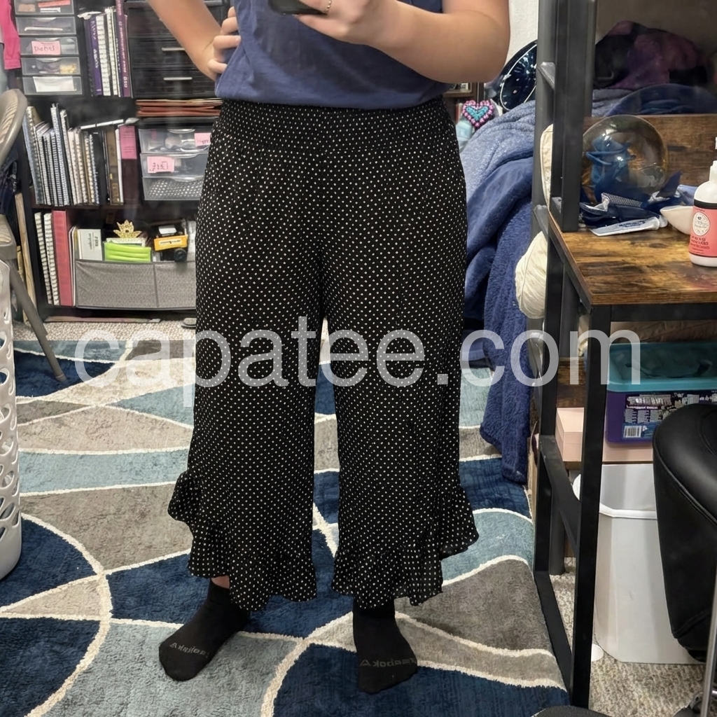 These high-waisted culottes feature a black base with tiny white polka dots. Wide-leg design with ruffled hem for a soft, flared look. Lightweight fabric perfect for warm weather. Ideal for casual outings or relaxed styles. Comfortable and effortlessly chic.