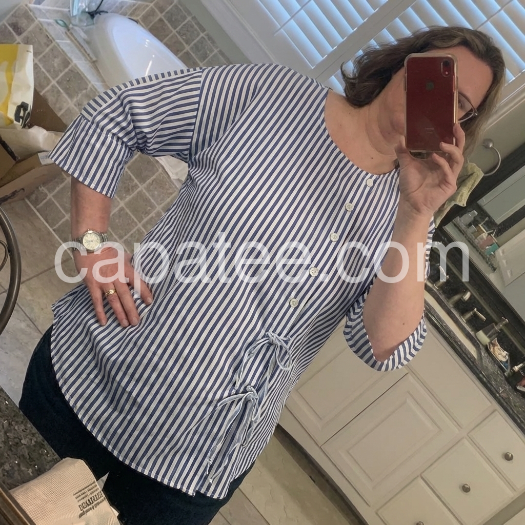 This loose-fit top features vertical blue and white stripes with a clean, casual look. Round neckline and front button-down design for easy wear. Side ties add a feminine touch. Three-quarter sleeves with rolled cuffs. Perfect for everyday comfort and effortless style.