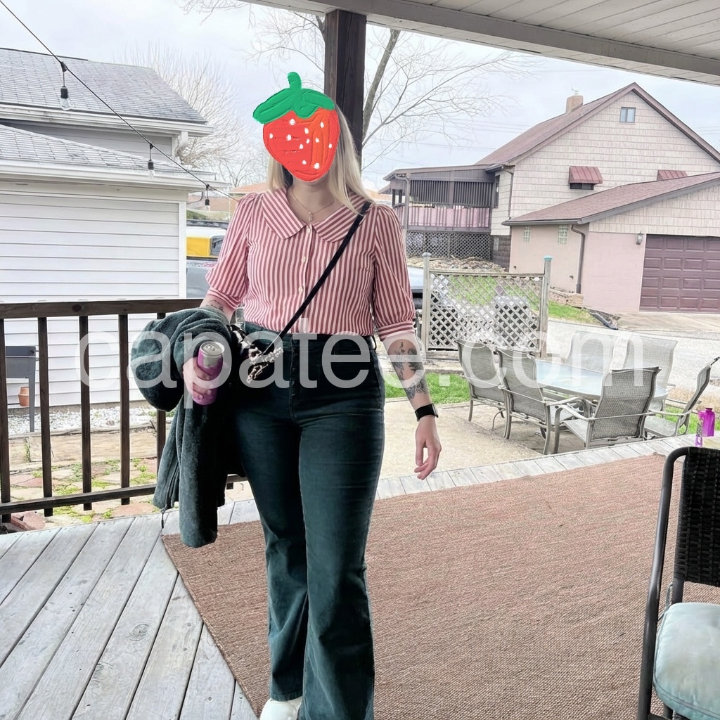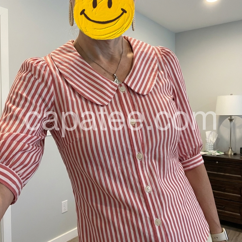 I absolutely love the vintage vibe of this blouse! The Peter Pan collar is so darling and adds a sweet touch to any outfit. The red and white stripes are vibrant and perfect for spring. It fits true to size and looks great paired with white jeans just like in the photo. Highly recommend!