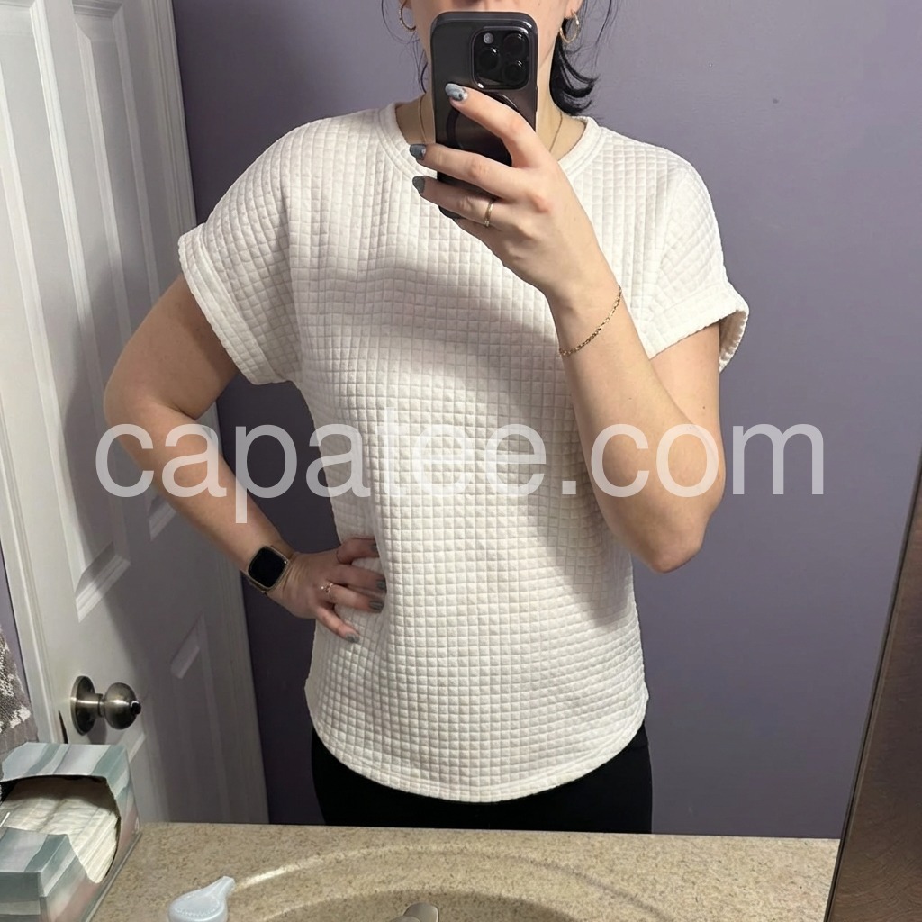 A crisp, elegant white top that goes with everything. The waffle-like texture is so trendy right now. It is my new go-to shirt for effortlessly putting together an outfit.