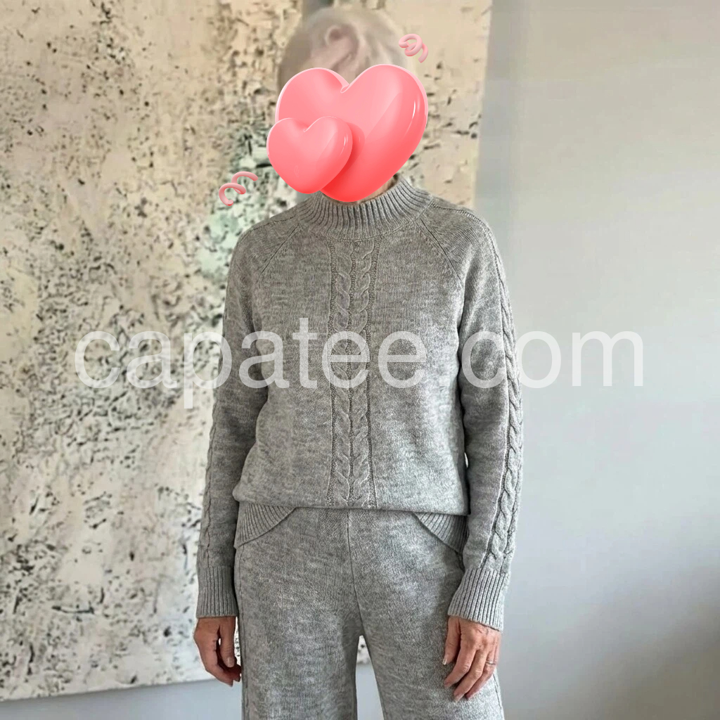 I love this set! The gray knit is soft and warm, and the cable detail on the sweater looks really nice. The pants fit comfortably and the whole outfit has a flattering, relaxed look. It’s perfect for staying in but still looks put together. Looks exactly like the photos and feels well made.